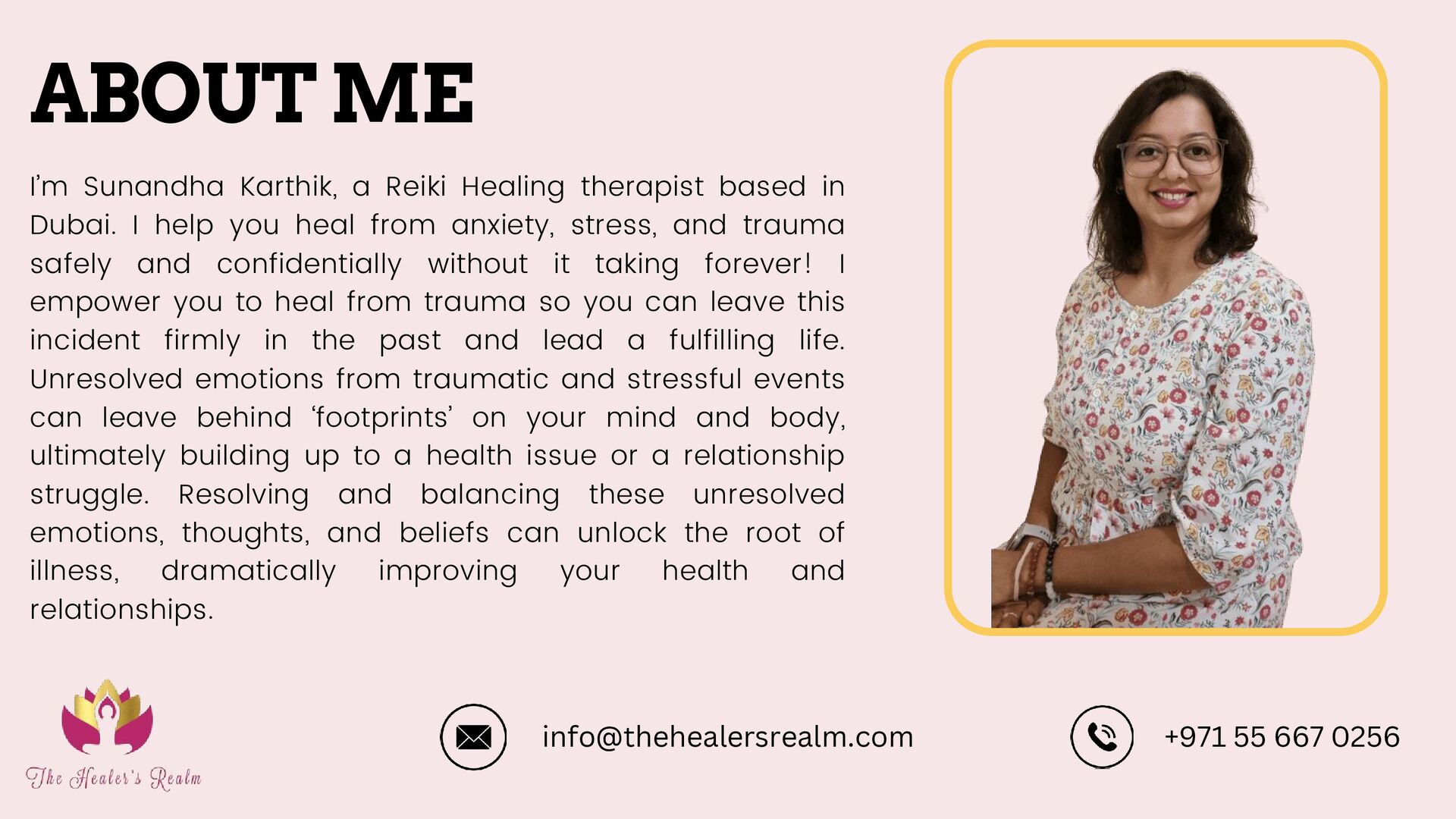 I help you heal from anxiety, stress, and trauma safely and confidentially without it taking forever! I empower you to heal from trauma so you can leave this incident firmly in the past and lead a fulfilling life. Unresolved emotions from traumatic and stressful events can leave behind ‘footprints’ on your mind and body, ultimately building up to a health issue or a relationship struggle. Resolving and balancing these unresolved emotions, thoughts, and beliefs can unlock the root of illness, dramatically improving your health and relationships. ABOUT ME +971 55 667 0256