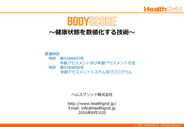 © 2016 HealthGrid Inc. All Rights Reserved. BodyScoreはHealthGridが開発したTA技術を利用してします。 TA (Total