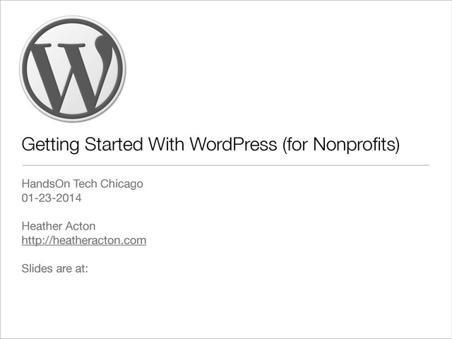 A 2 hour primer on getting rolling with WordPress (self-hosted), with some specific tips and tricks helpful for nonprofits. Presented for nonprofit professionals via the HandsOn Tech Chicago series.