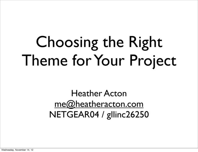 http://wordpress.org/extend/themes • Premium themes & child themes • StudioPress, WooThemes, Theme Trust, Elegant Themes • Theme frameworks • Pagelines, Genesis, Headway • Starter themes • Underscores, Twenty Twelve (or Eleven or Ten), Toolbox Wednesday, November 14, 12