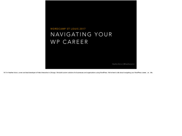 U R W P C A R E E R L I F E W O R D C A M P S T L O U I S 2 0 1 7 Heather Acton | @heatheracton Hi! I’m Heather Acton, owner and lead developer of Helio Interactive in Chicago. We build custom solutions for businesses and organizations using WordPress. We’re here to talk about navigating your WordPress career…er…life.