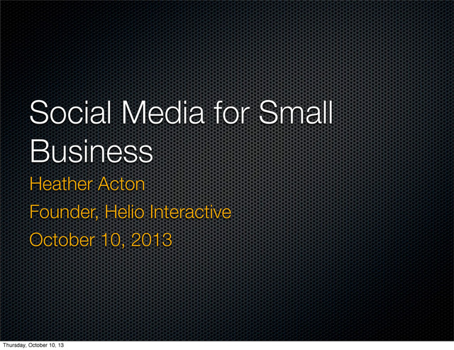 important for SMBs? Which forms of social media are most effective? How do you manage your social media activity (strategy / tools)? How do you measure the results of social media activity? Thursday, October 10, 13
