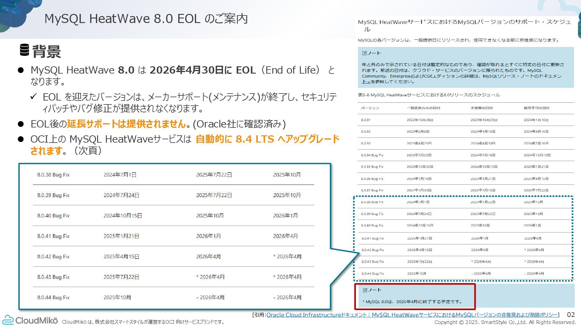MySQL HeatWave 8.0 EOL および 8.4 LTS 自動アップグレードに関するご案内