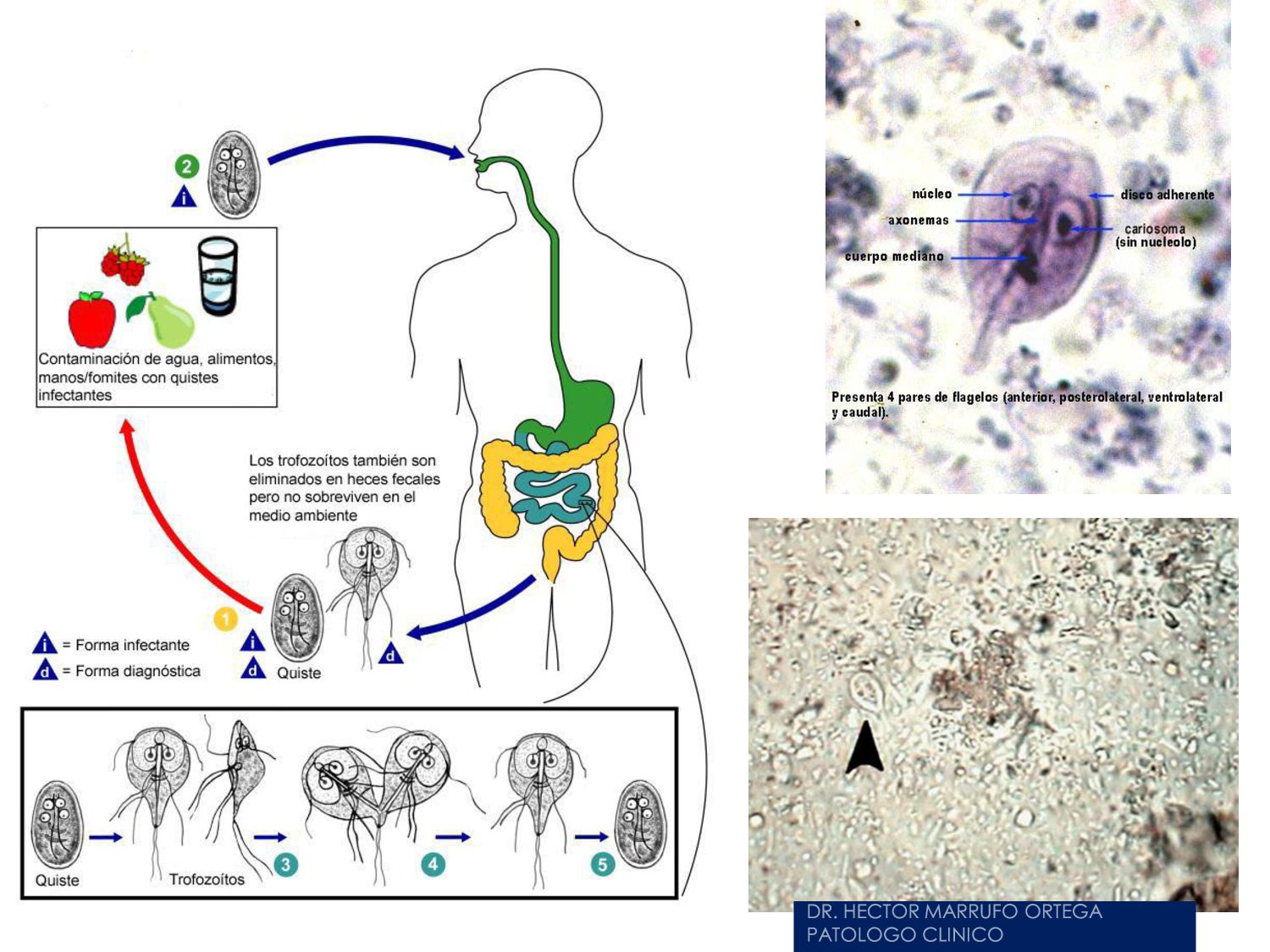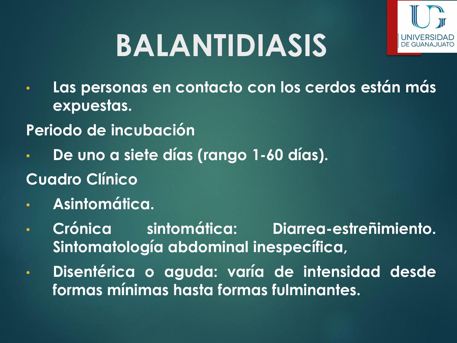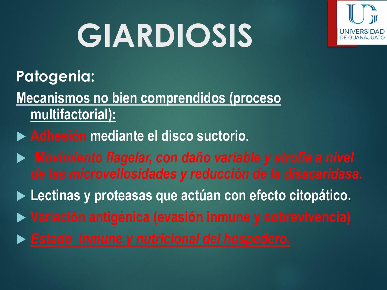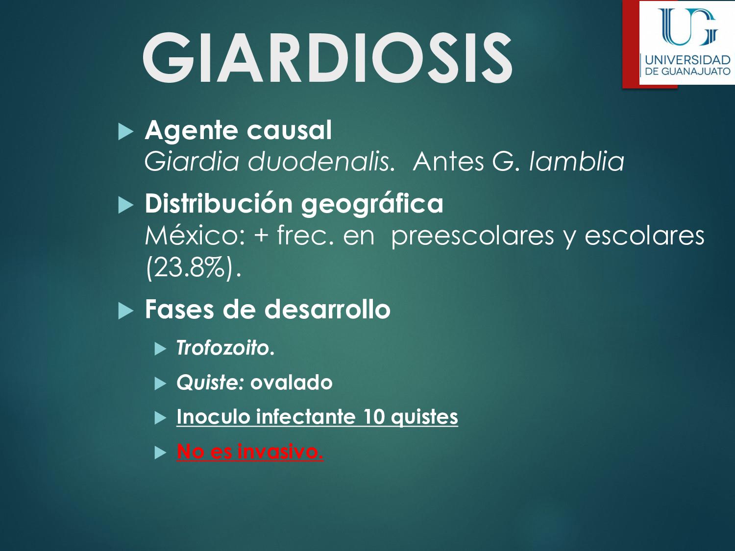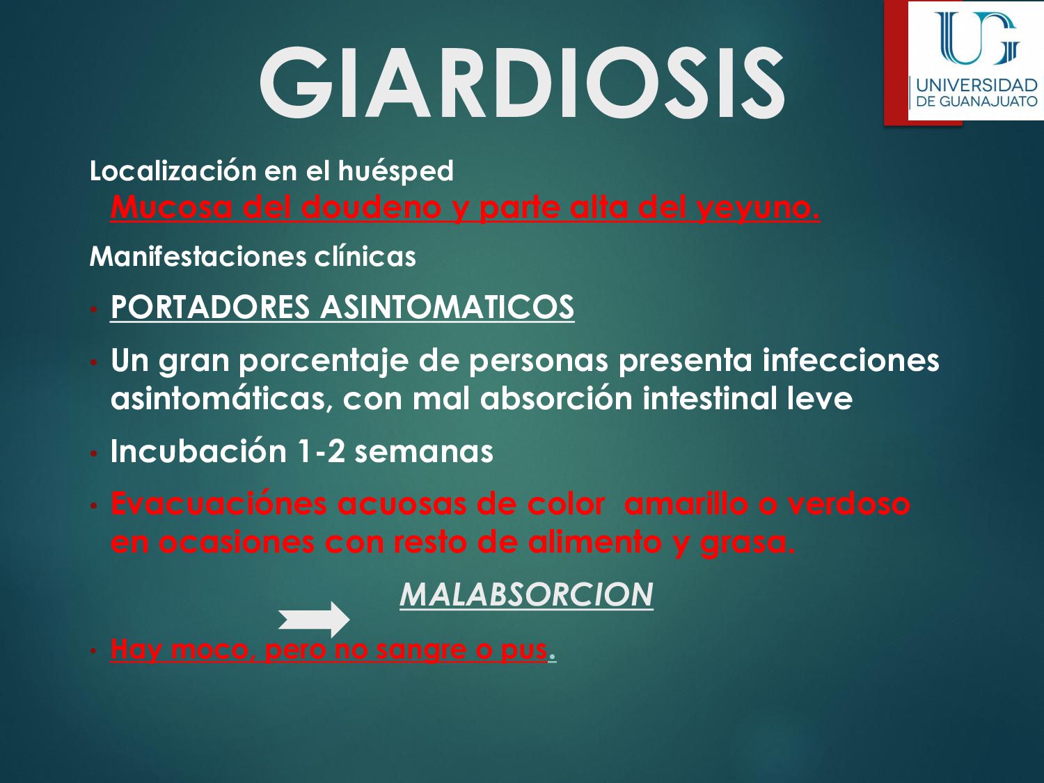 náusea, vómito, disminución del apetito, astenia. La enfermedad aguda suele resolverse en unas semanas, aún sin tratamiento. 30 - 50% desarrolla una parasitosis crónica: Diarrea recurrente, Esteatorrea, Evidencia bioquímica de malabsorción de grasas, lactosa, vitamina A y vitamina B12, Disminución de peso y deficiencias en el crecimiento y desarrollo infantil.