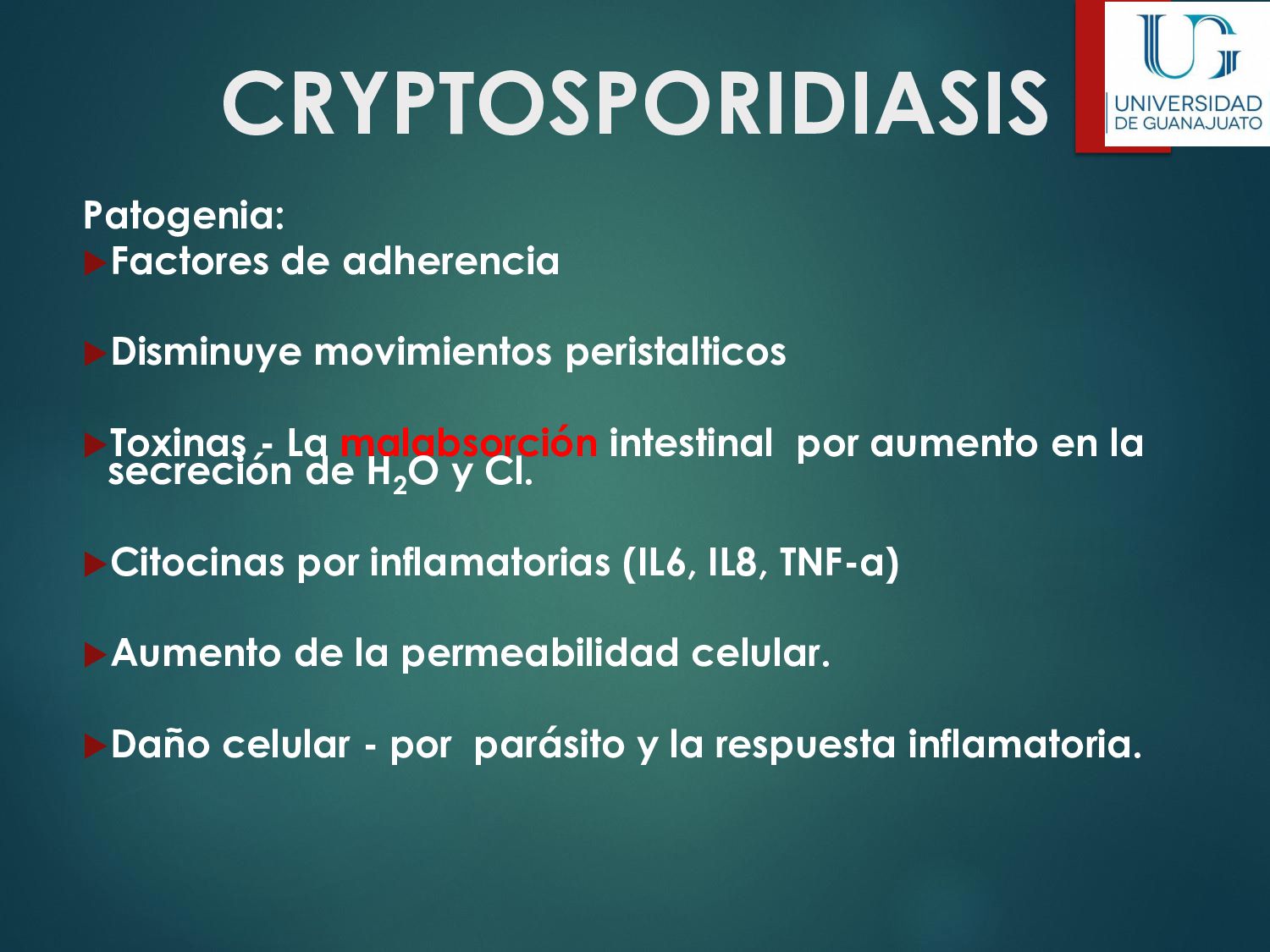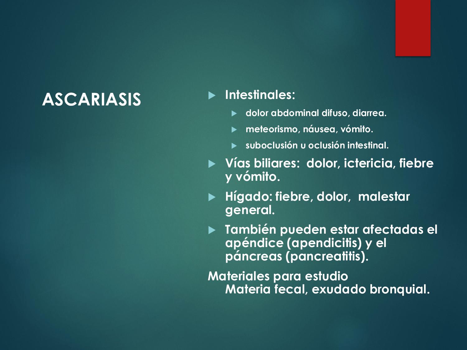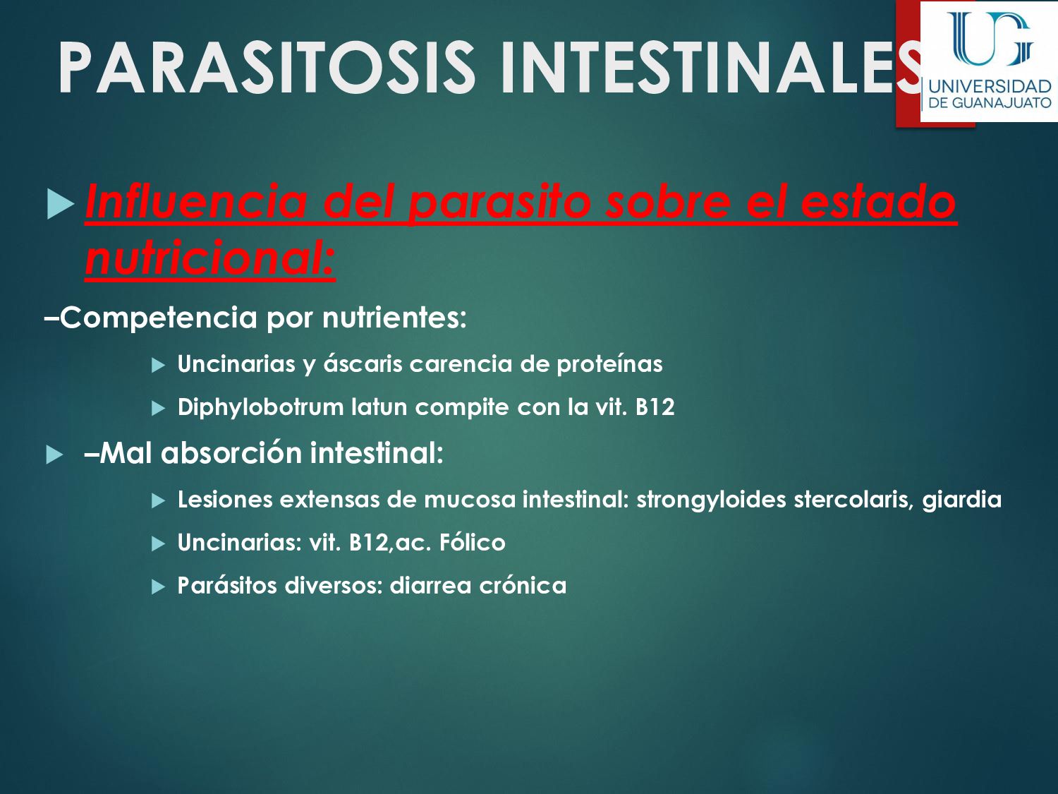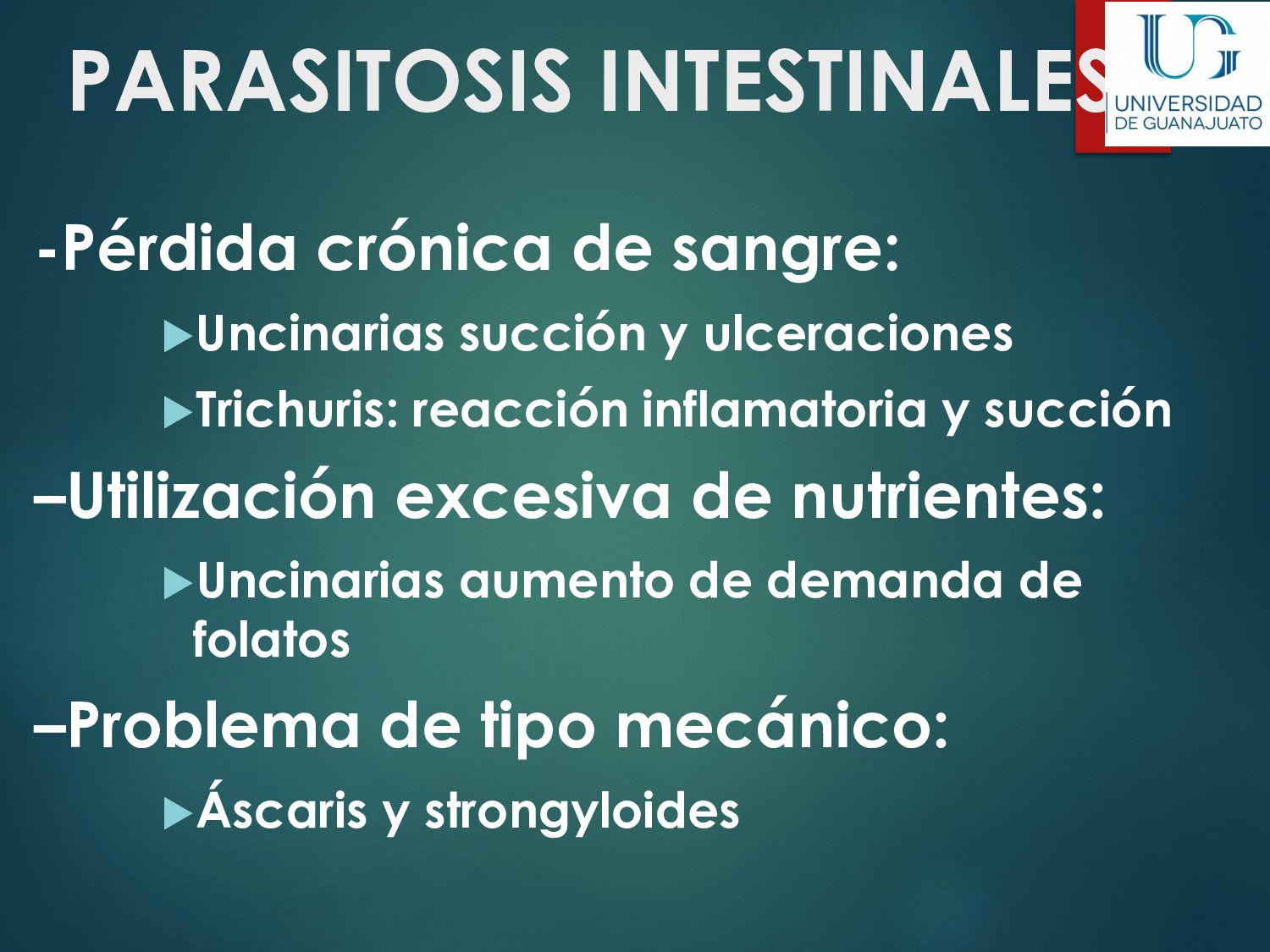 náusea, vómito, disminución del apetito, astenia. La enfermedad aguda suele resolverse en unas semanas, aún sin tratamiento. 30 - 50% desarrolla una parasitosis crónica: Diarrea recurrente, Esteatorrea, Evidencia bioquímica de malabsorción de grasas, lactosa, vitamina A y vitamina B12, Disminución de peso y deficiencias en el crecimiento y desarrollo infantil.