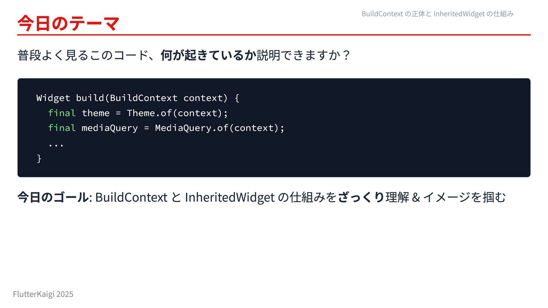 final mediaQuery = MediaQuery.of(context); ... } 今日のゴール: BuildContext と InheritedWidget の仕組みをざっくり理解 & イメージを掴む BuildContext の正体と InheritedWidget の仕組み FlutterKaigi 2025