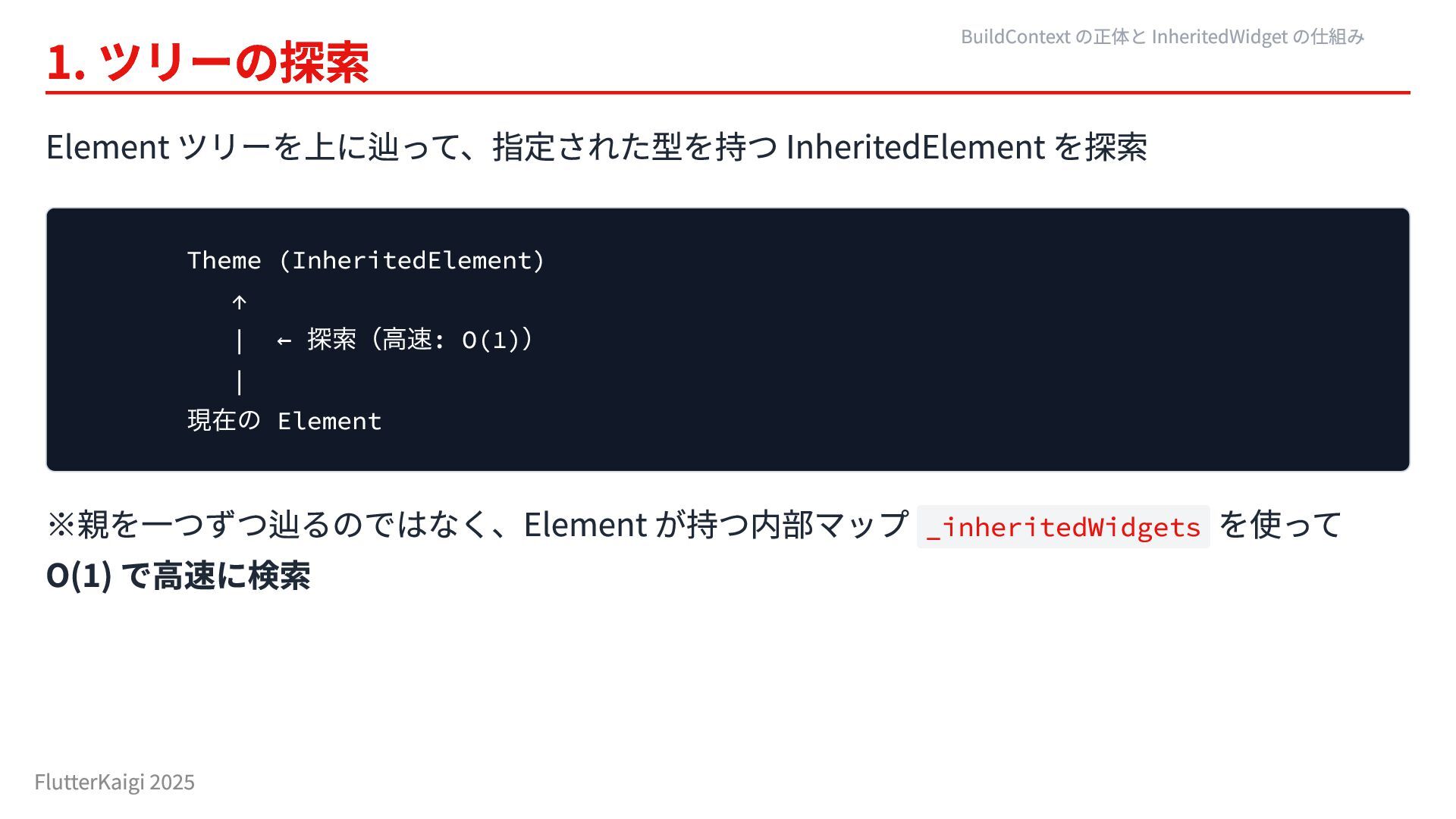 ← 探索(高速: O(1) ) | 現在の Element ※親を一つずつ辿るのではなく、Element が持つ内部マップ _inheritedWidgets を使って O(1) で高速に検索 BuildContext の正体と InheritedWidget の仕組み FlutterKaigi 2025