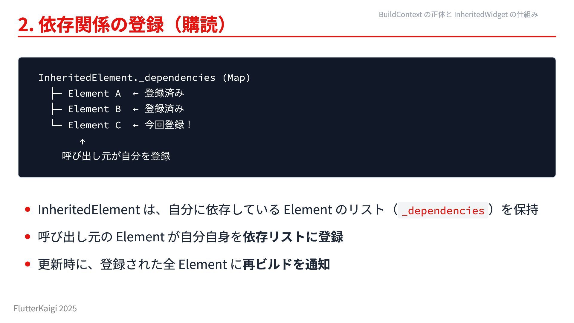 Element B ← 登録済み └─ Element C ← 今回登録! ↑ 呼び出し元が自分を登録 InheritedElement は、自分に依存している Element のリスト(_dependencies )を保持 呼び出し元の Element が自分自身を依存リストに登録 更新時に、登録された全 Element に再ビルドを通知 BuildContext の正体と InheritedWidget の仕組み FlutterKaigi 2025