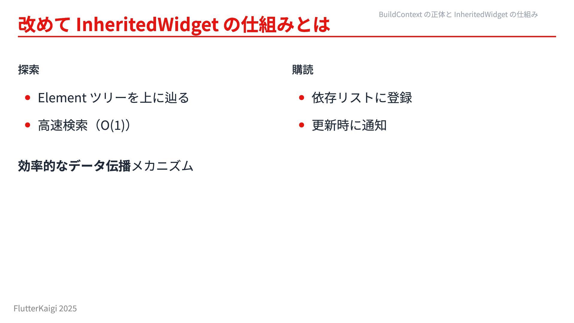 効率的なデータ伝播メカニズム BuildContext の正体と InheritedWidget の仕組み FlutterKaigi 2025