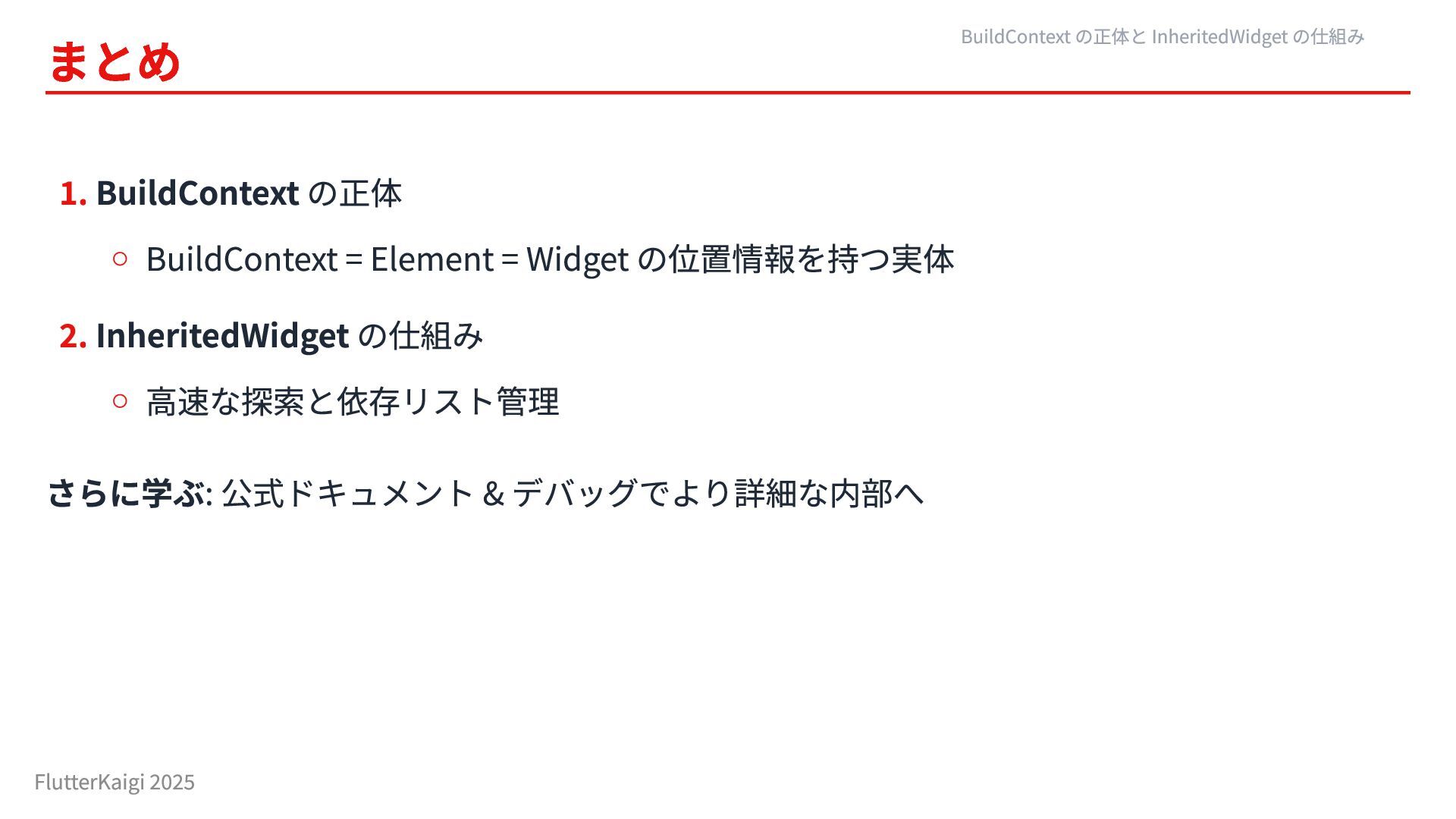2. InheritedWidget の仕組み 高速な探索と依存リスト管理 さらに学ぶ: 公式ドキュメント & デバッグでより詳細な内部へ BuildContext の正体と InheritedWidget の仕組み FlutterKaigi 2025