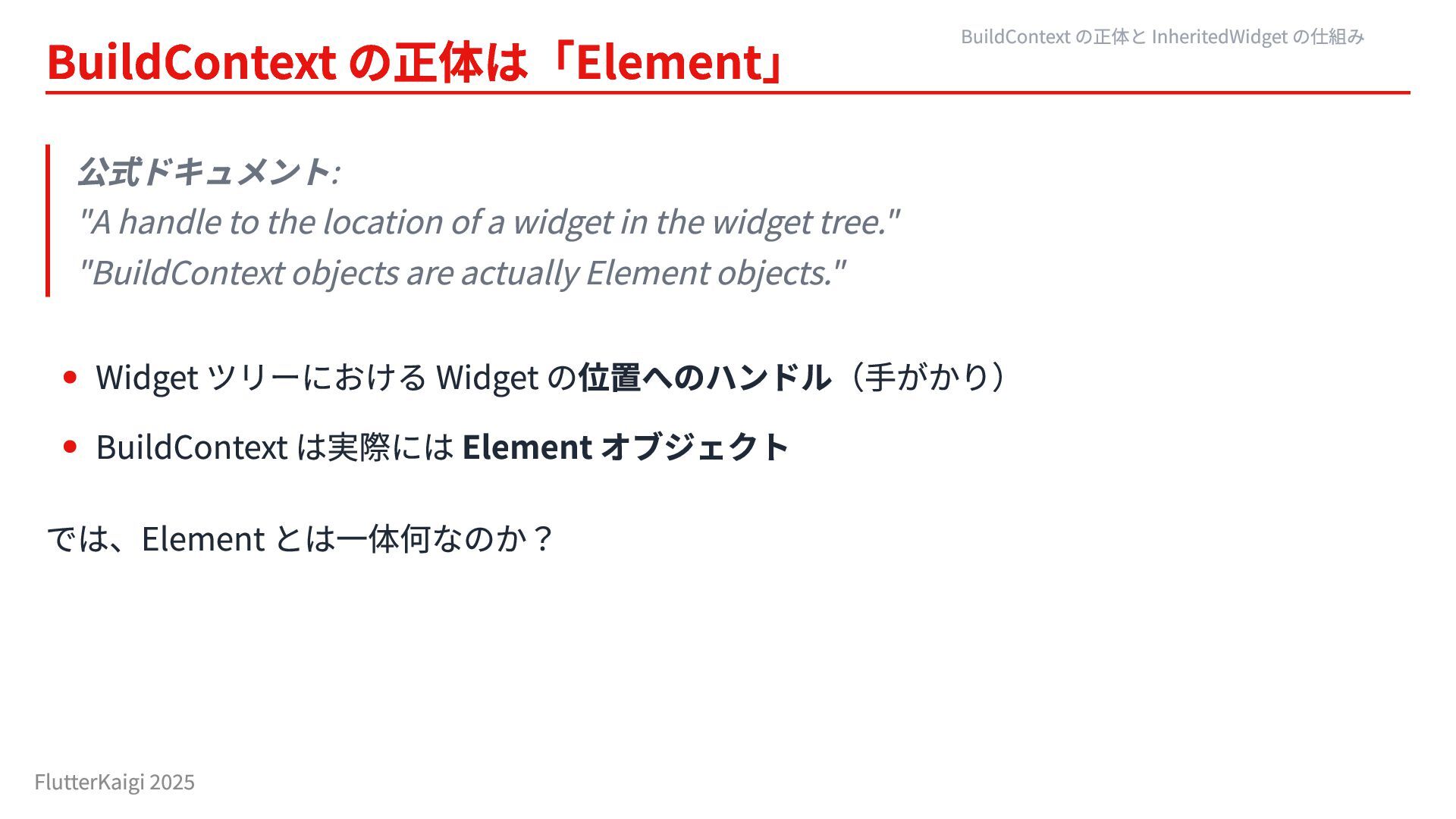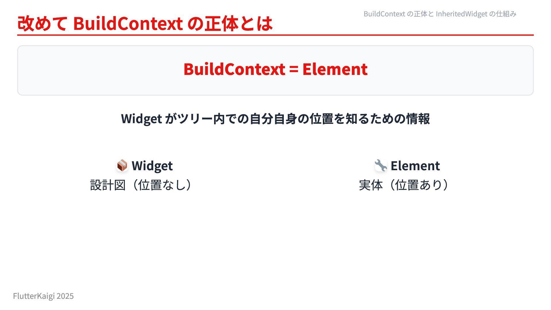 Element 実体(位置あり) BuildContext の正体と InheritedWidget の仕組み FlutterKaigi 2025