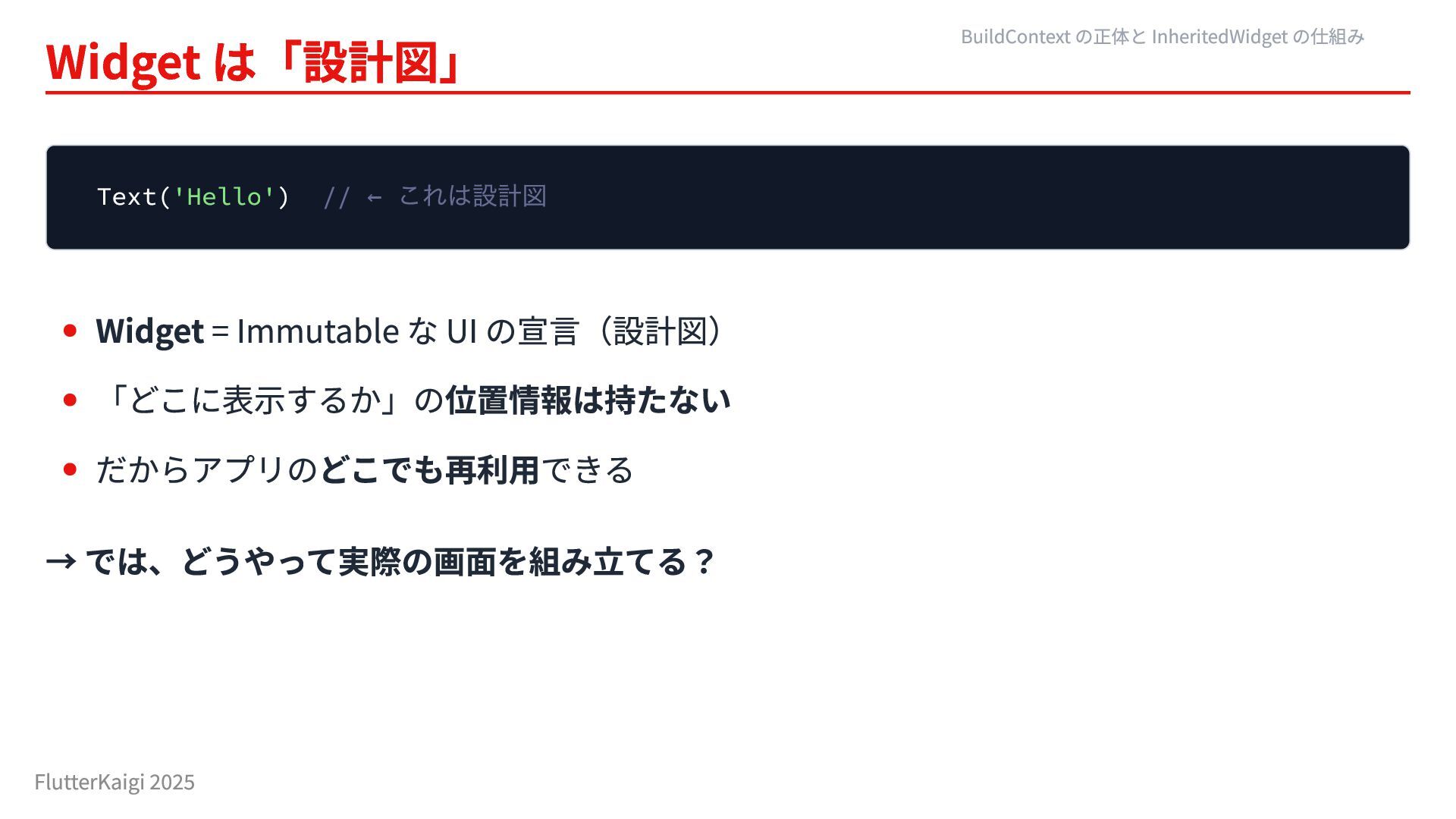 UI の宣言(設計図) 「どこに表示するか」の位置情報は持たない だからアプリのどこでも再利用できる → では、どうやって実際の画面を組み立てる? BuildContext の正体と InheritedWidget の仕組み FlutterKaigi 2025