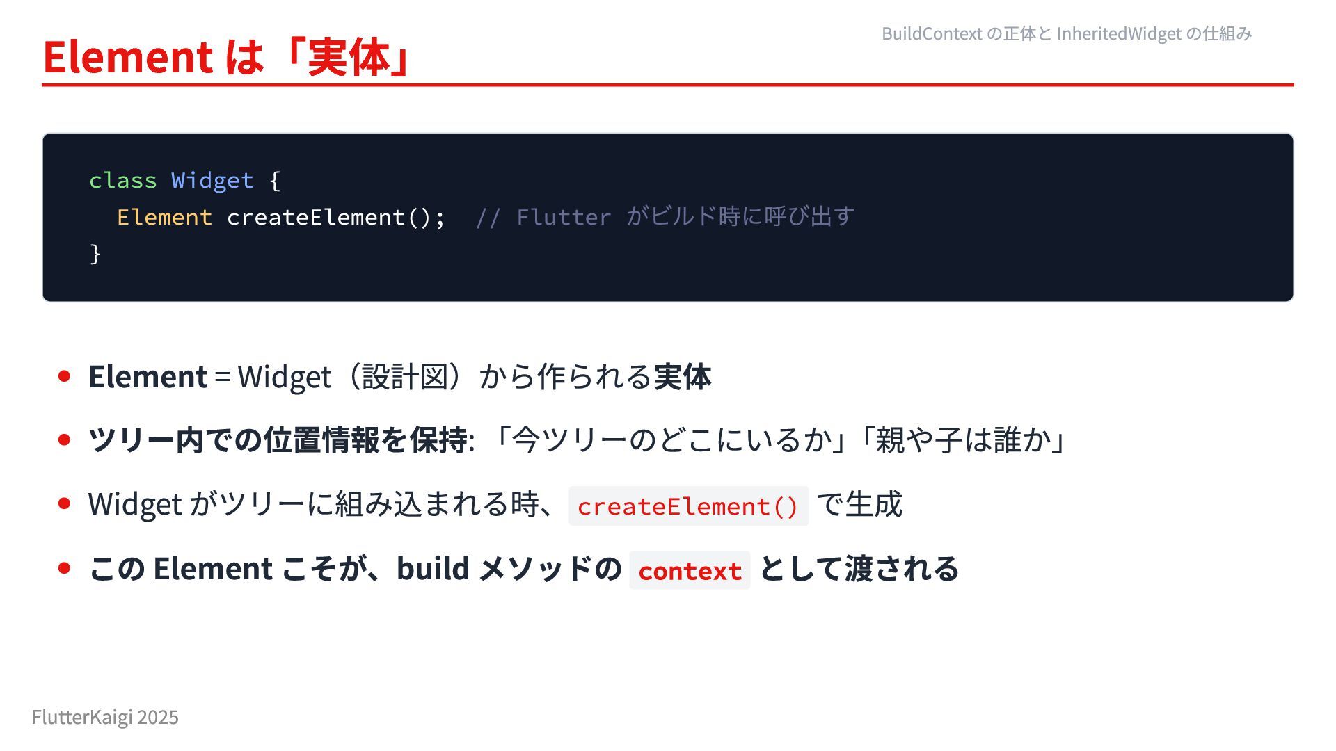 } Element = Widget(設計図)から作られる実体 ツリー内での位置情報を保持: 「今ツリーのどこにいるか」 「親や子は誰か」 Widget がツリーに組み込まれる時、createElement() で生成 この Element こそが、build メソッドの context として渡される BuildContext の正体と InheritedWidget の仕組み FlutterKaigi 2025