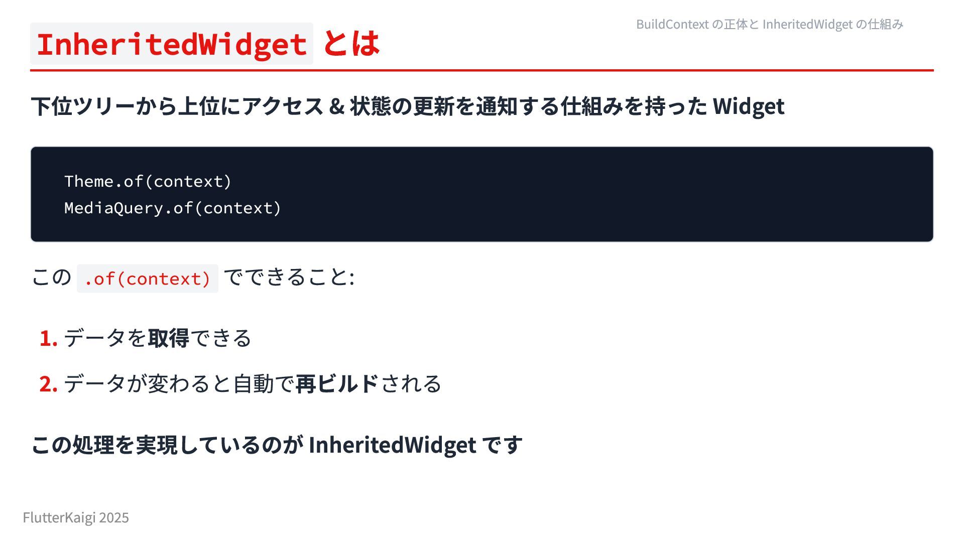 でできること: 1. データを取得できる 2. データが変わると自動で再ビルドされる この処理を実現しているのが InheritedWidget です BuildContext の正体と InheritedWidget の仕組み FlutterKaigi 2025