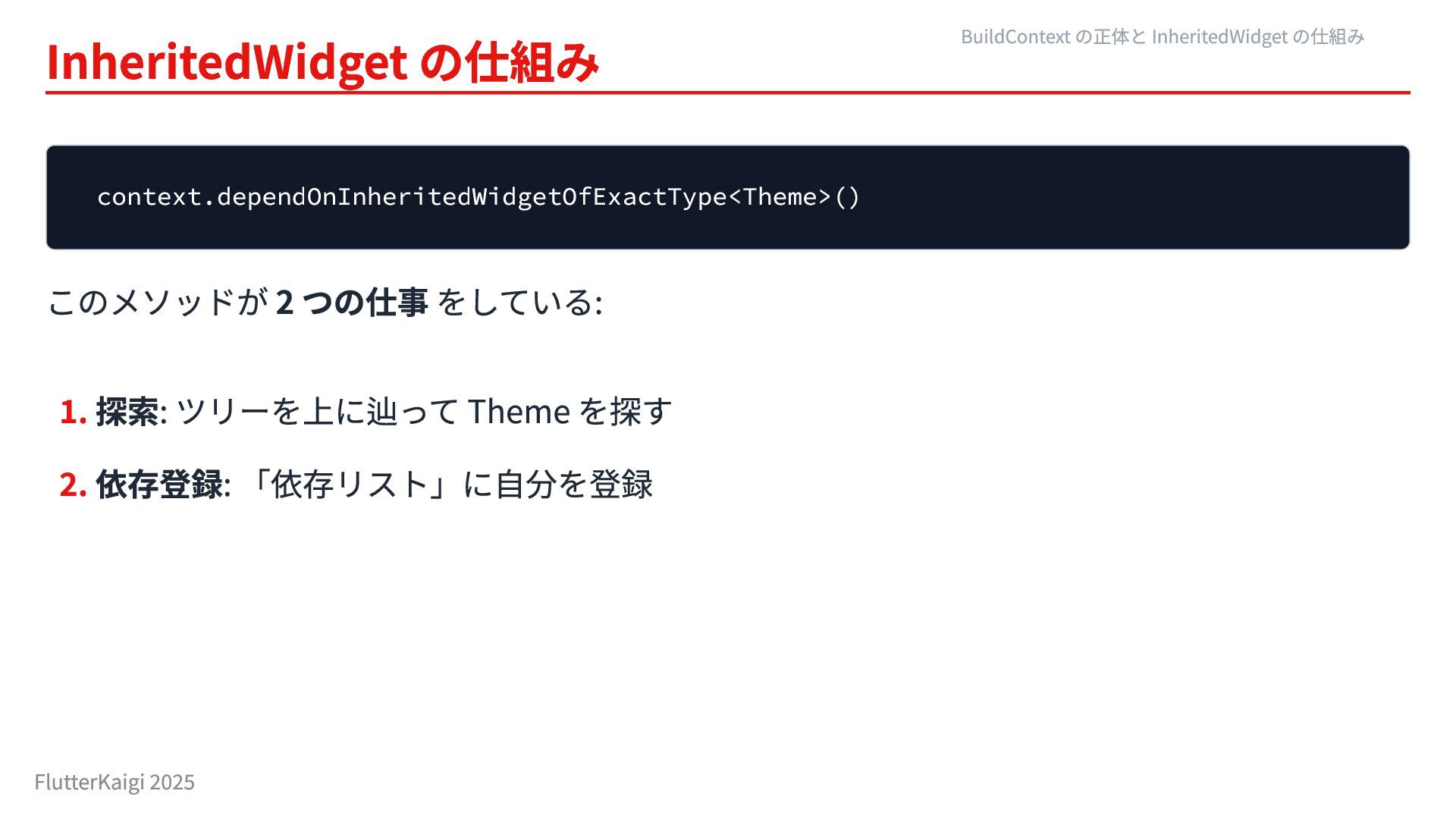 Theme を探す 2. 依存登録: 「依存リスト」に自分を登録 BuildContext の正体と InheritedWidget の仕組み FlutterKaigi 2025