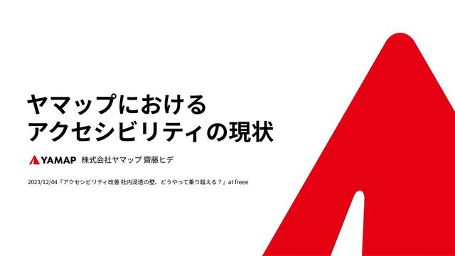 2023/12/04『アクセシビリティ改善 社内浸透の壁、どうやって乗り越える?』at freee ヤマップにおける アクセシビリティの現状 株式会社ヤマップ 齋藤ヒデ