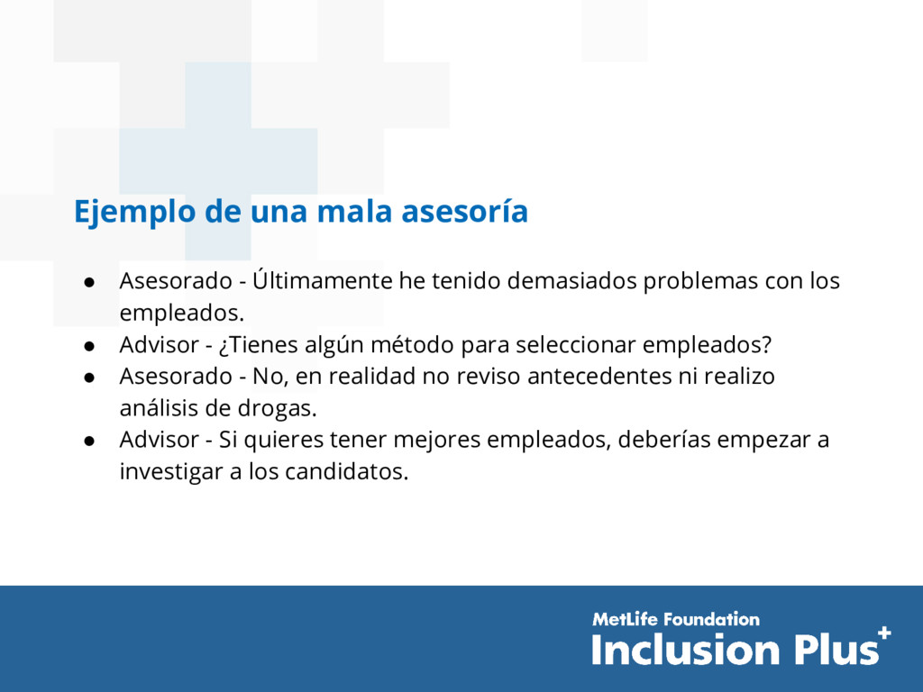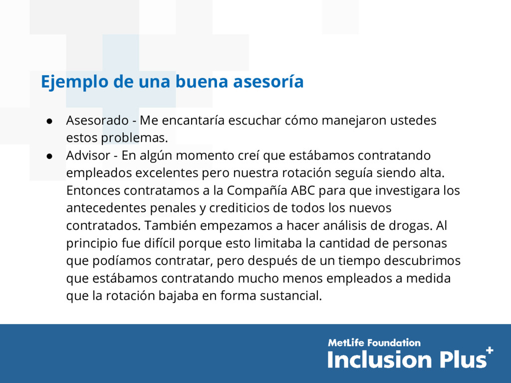 escuchar cómo manejaron ustedes estos problemas. • Advisor - En algún momento creí que estábamos contratando empleados excelentes pero nuestra rotación seguía siendo alta. Entonces contratamos a la Compañía ABC para que investigara los antecedentes penales y crediticios de todos los nuevos contratados. También empezamos a hacer análisis de drogas. Al principio fue difícil porque esto limitaba la cantidad de personas que podíamos contratar, pero después de un tiempo descubrimos que estábamos contratando mucho menos empleados a medida que la rotación bajaba en forma sustancial.