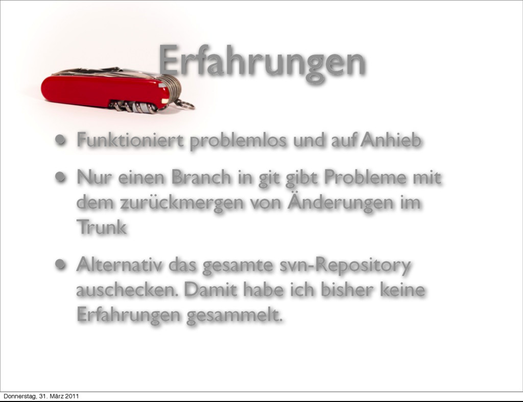 Branch in git gibt Probleme mit dem zurückmergen von Änderungen im Trunk • Alternativ das gesamte svn-Repository auschecken. Damit habe ich bisher keine Erfahrungen gesammelt. Donnerstag, 31. März 2011