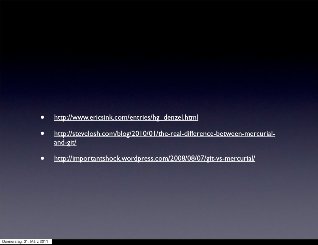 • http://www.ericsink.com/entries/hg_denzel.html • http://stevelosh.com/blog/2010/01/the-real-difference-between-mercurial- and-git/ • http://importantshock.wordpress.com/2008/08/07/git-vs-mercurial/ Donnerstag, 31. März