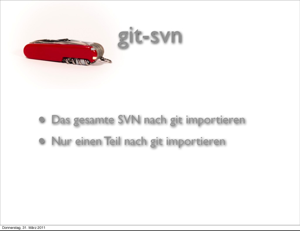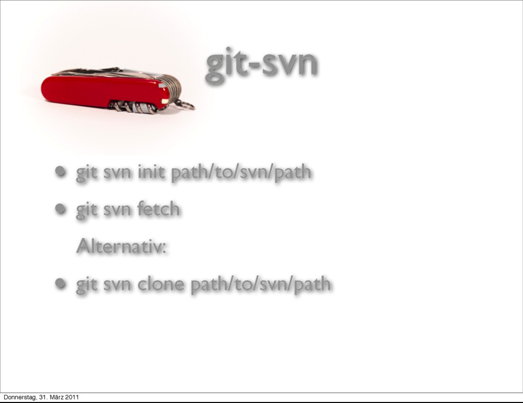 Alternativ: • git svn clone path/to/svn/path Donnerstag, 31. März 2011