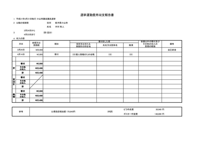 事務所の所在地 氏名又は団体名 職業 ¥20,409 自己資金 ¥5,000 (※)個人情報のため省略 (※) (※) 寄付 ¥5,000 その他 の収入 ¥20,409 計 ¥25,409 寄付 その他 の収入 計 寄付 ¥5,000 その他 の収入 ¥20,409 計 ¥25,409 ビラ作成費 30,040 円 ポスター作製費 148,800 円 種別 寄付 参考 公費負担相当額 178,840円 (内訳) 平成31年4月21日執行 小山市議会議員選挙 収入の部 3 3月24日から 4月23日まで (第1回分) 3月24日 4月14日 前 回 計 計 総 額 選挙運動費用収支報告書 寄付をした者 金額又は 見積額 金銭以外の寄付及び その他の収入の 見積の根拠 備考 月日