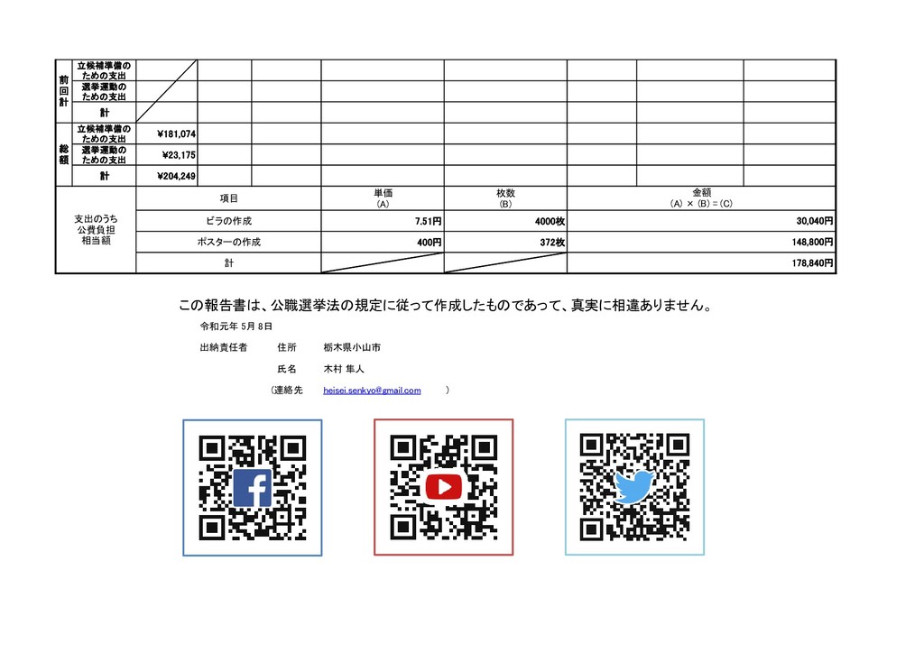 ニッセイアロマスクエア16階 株式会社カウネット 選挙運動用ハガキ 印刷用 ¥30,040 〃 ビラ印刷代 小山市若木町1-23-4 株式会社ダイサン小山 印刷業 1枚7.51円×4000枚 (公費負担分) ¥148,800 〃 ポスター印刷代 〃 〃 〃 1枚400円×372枚 (公費負担分) ¥181,074 ¥7,776 選挙運動 ビラ折込代 小山市東城南4-19-16 ASA小山南部 新聞販売業 1枚3.6円×2000枚 +消費税 ¥6,998 〃 〃 小山市犬塚2-1-12 有限会社なかだ 〃 1枚3.6円×1800枚 +消費税 ¥14,774 ¥1,000 選挙運動 ガソリン代 小山市宮本町2-7-26 イタバシ株式会社 セルフ宮本町 ¥3,700 〃 〃 小山市羽川802-2 (株)JAエルサポート じゃすぽーと小山SS ¥3,701 〃 〃 栃木市大宮町1419-5 (株)JAエルサポート じゃすぽーと栃木SS ¥8,401 立候補準備の ための支出 ¥181,074 選挙運動の ための支出 ¥23,175 計 ¥204,249 3月24日 計 合計 支出の 目的 4月20日 合計 (雑費) 4月16日 4月16日 4月23日 (印刷費) 4月4日 4月4日 合計 (広告費) 4月16日 月日 金額又は 見積額 区分 支出を受けた者 金銭以外の 支出の 見積の根拠 備考