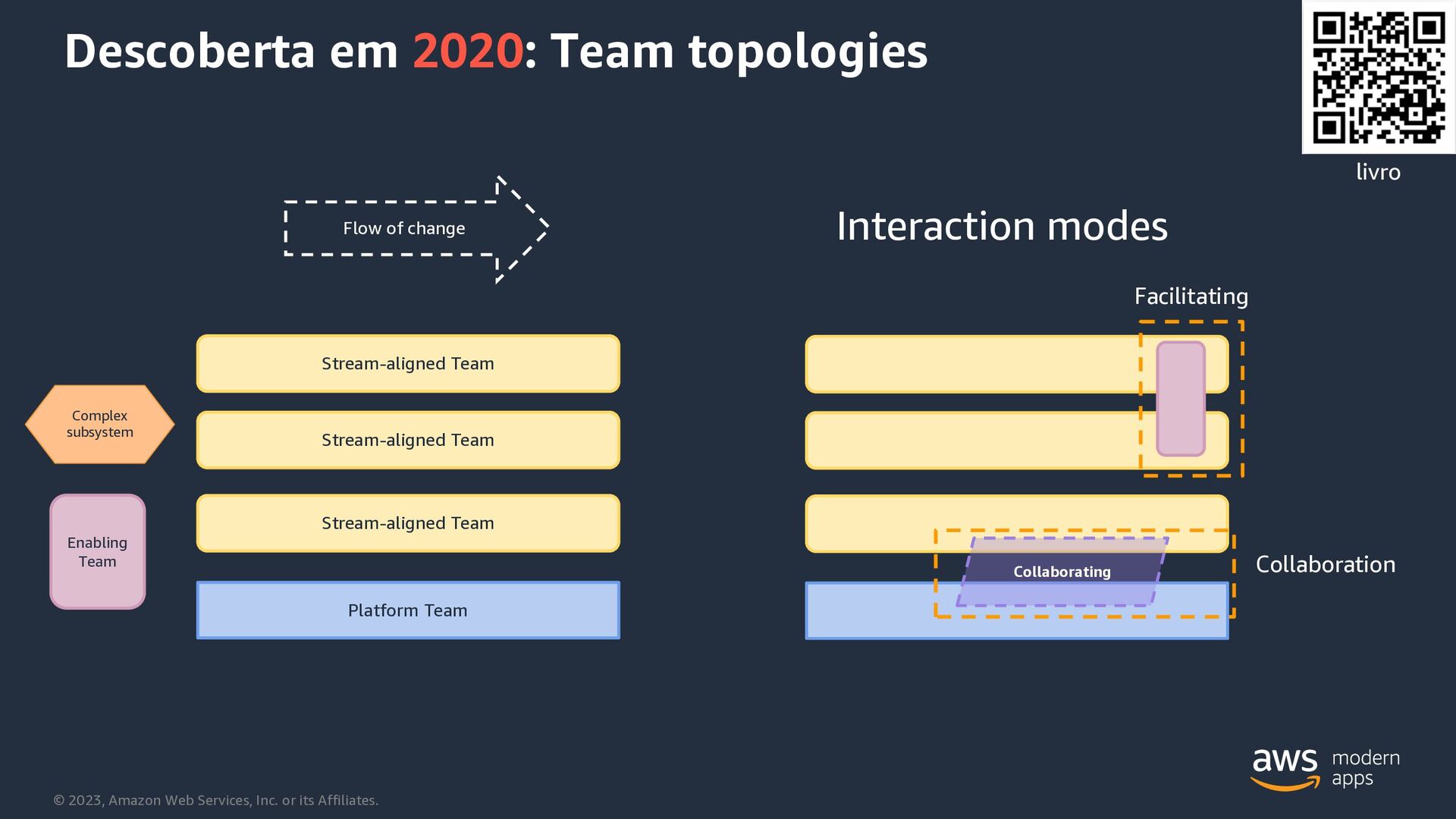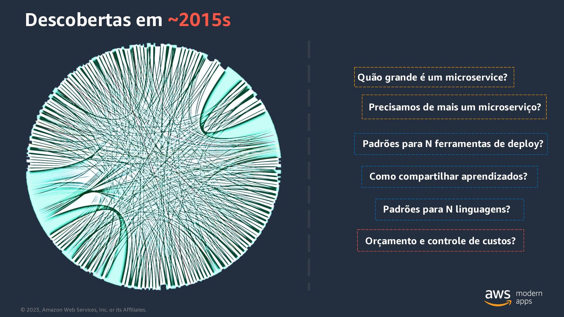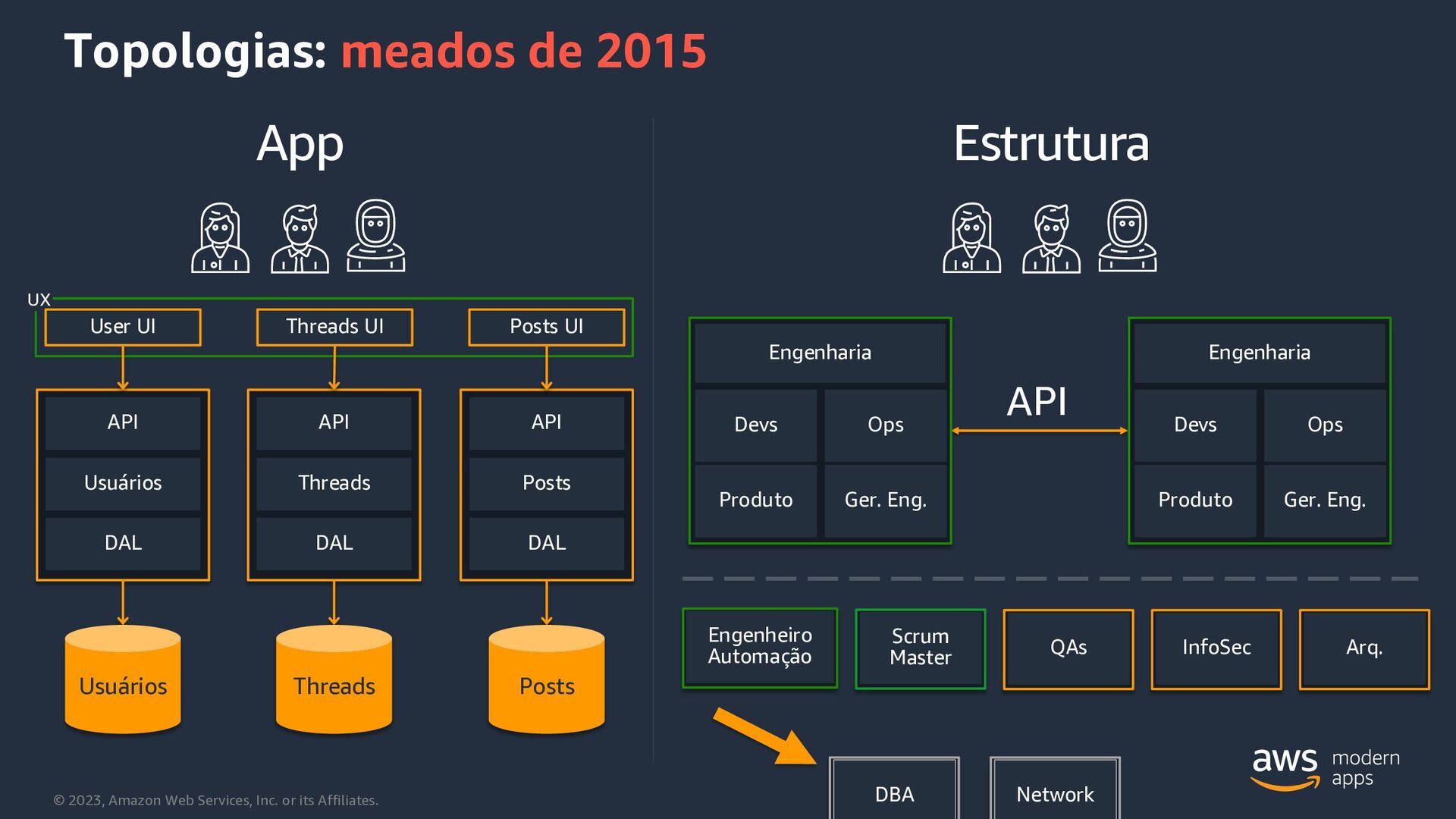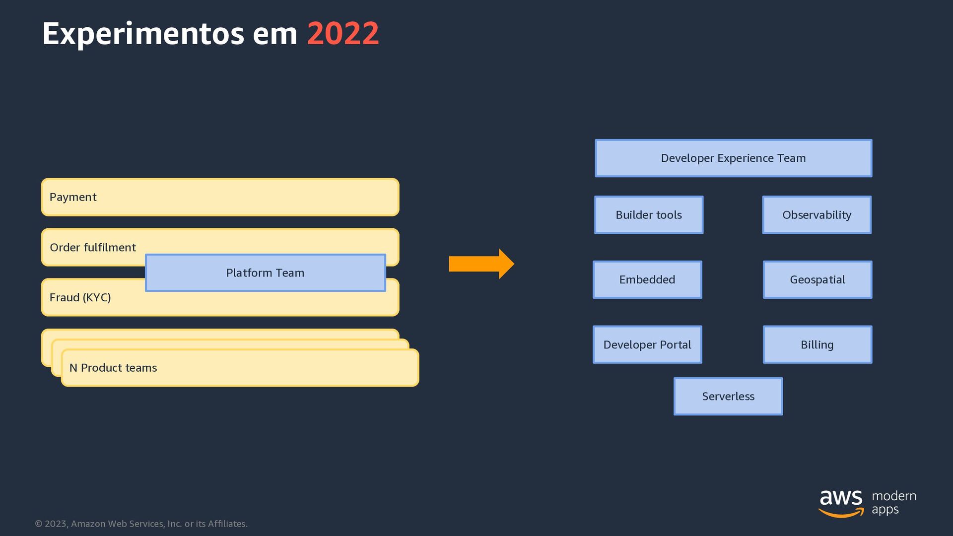 No final de 2016, à medida que mais organizações adotaram microsserviços, o processo de tomada de decisão se tornou mais descentralizado e, à medida que cresceram, as empresas aprenderam a se concentrar mais na construção da comunidade, no suporte e no fornecimento de orientação para evitar a repetição de erros do passado. Desde 2020 vemos o crescimento de Serverless e times divididos por área, o que nos leva a uma nova era de equipes cada vez menores, mas mais especializadas e adaptáveis às mudanças nos negócios.