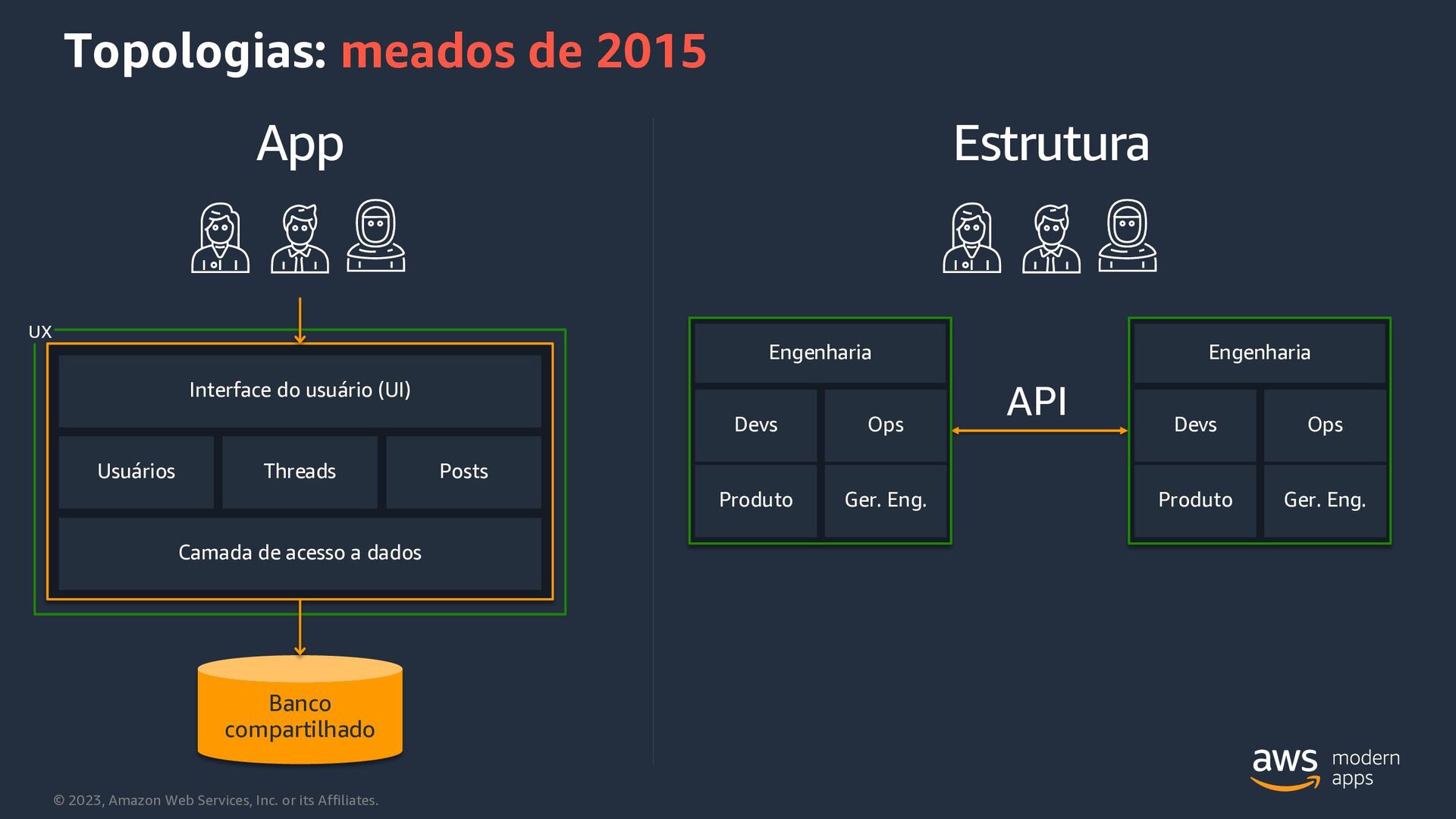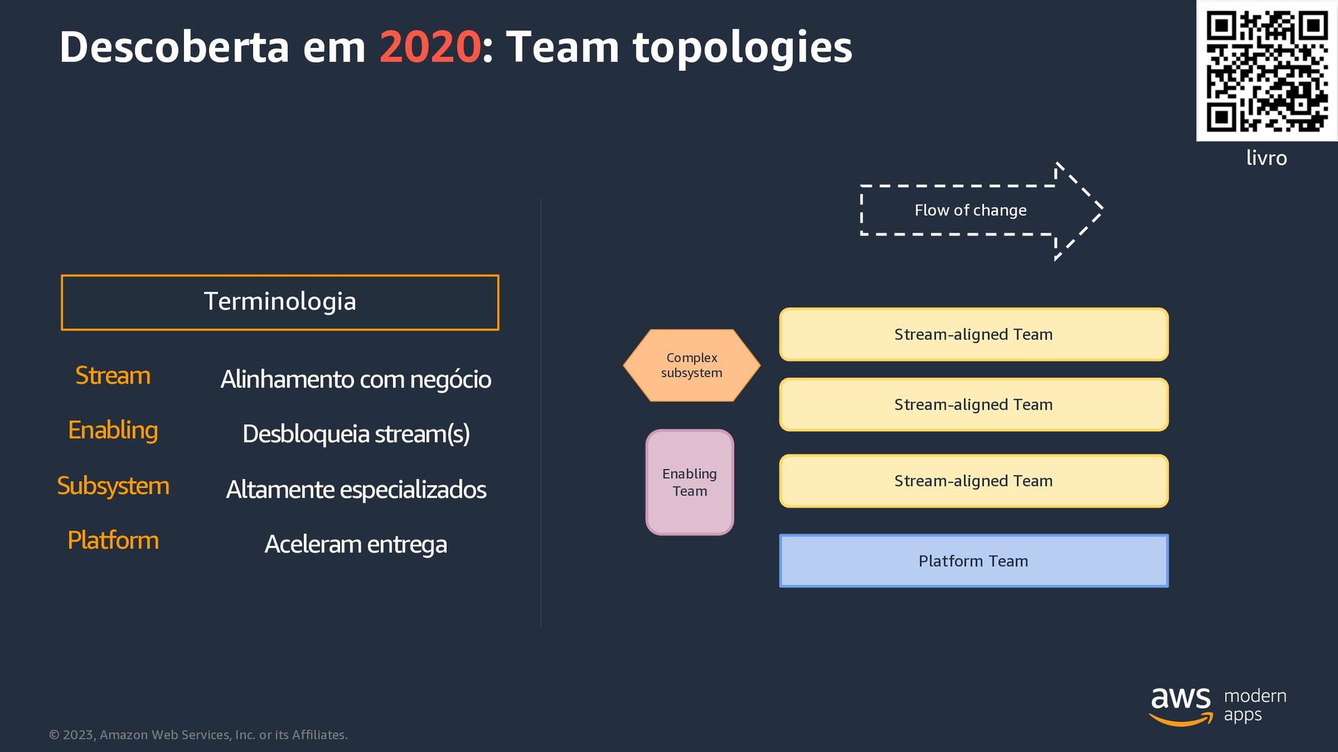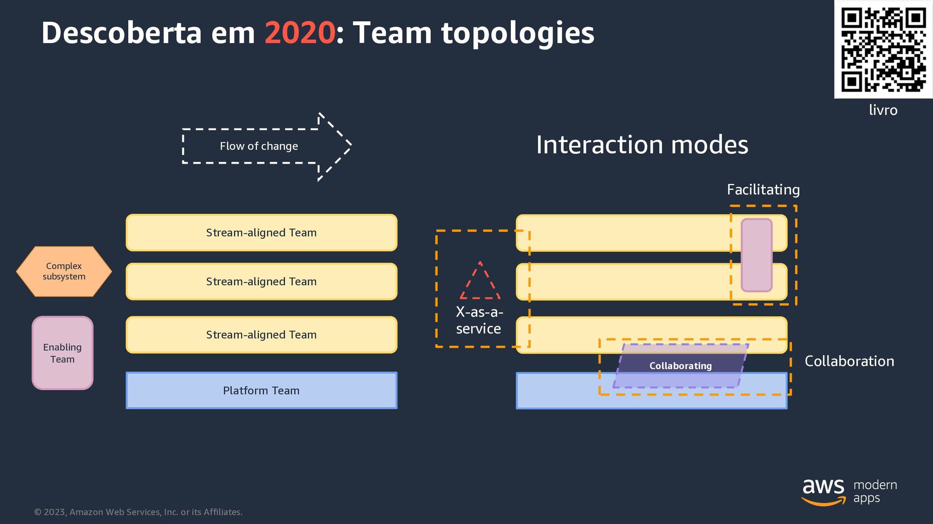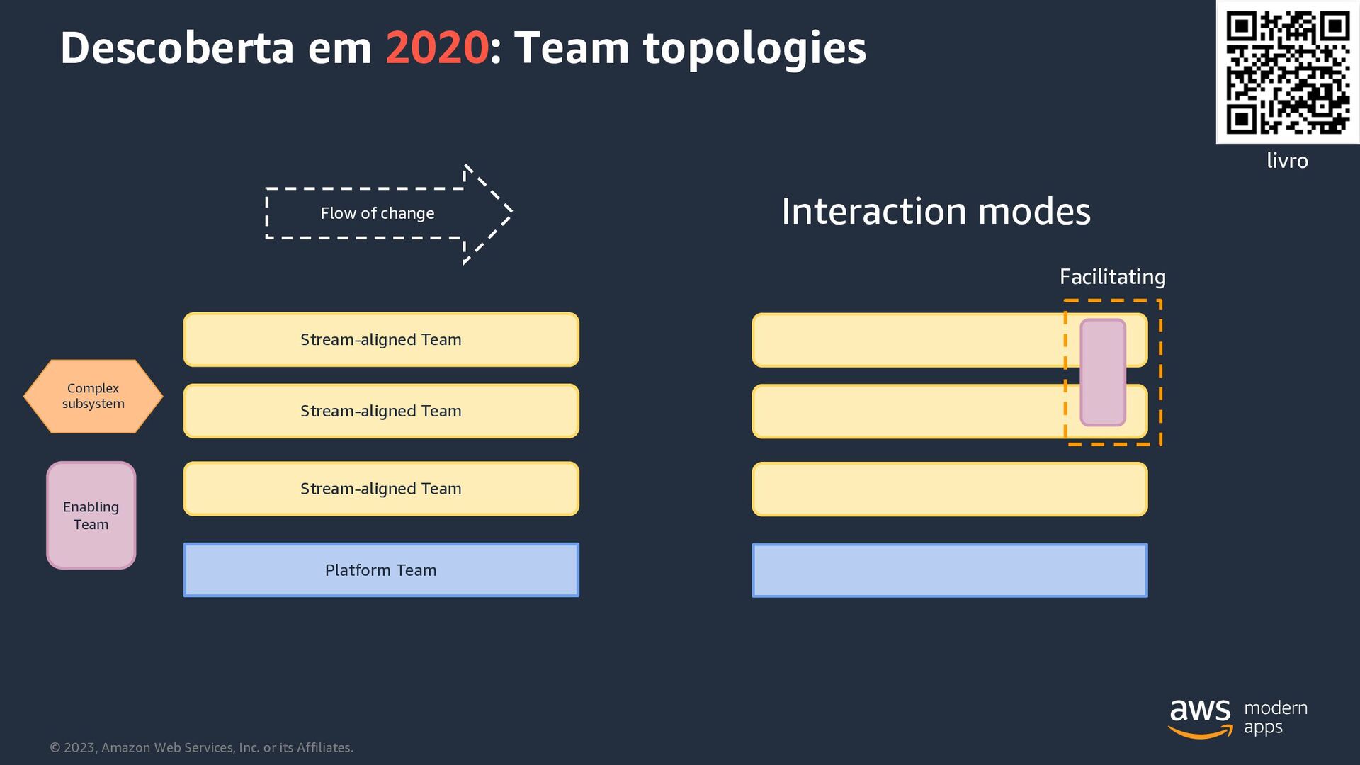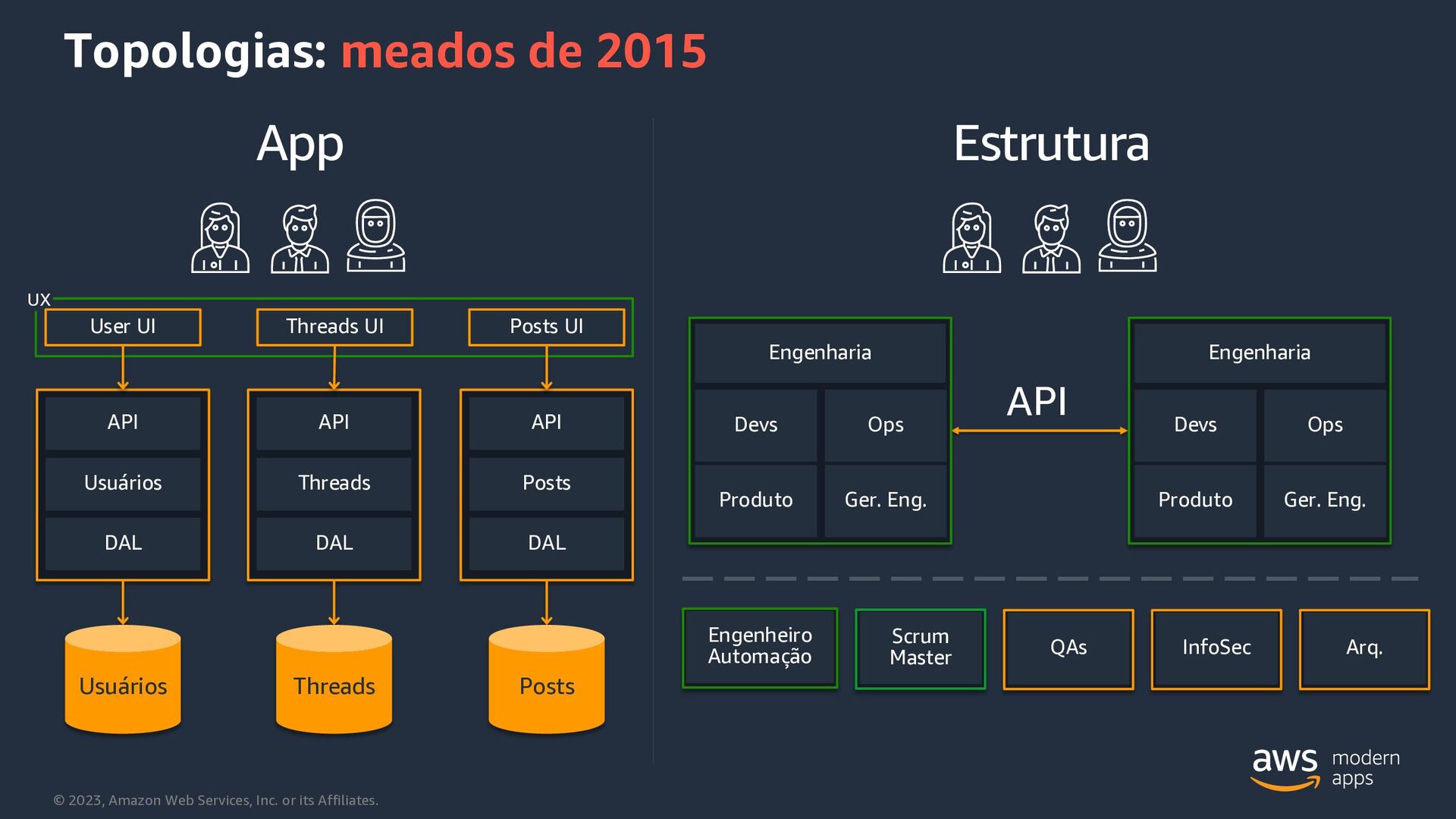 No final de 2016, à medida que mais organizações adotaram microsserviços, o processo de tomada de decisão se tornou mais descentralizado e, à medida que cresceram, as empresas aprenderam a se concentrar mais na construção da comunidade, no suporte e no fornecimento de orientação para evitar a repetição de erros do passado. Desde 2020 vemos o crescimento de Serverless e times divididos por área, o que nos leva a uma nova era de equipes cada vez menores, mas mais especializadas e adaptáveis às mudanças nos negócios.