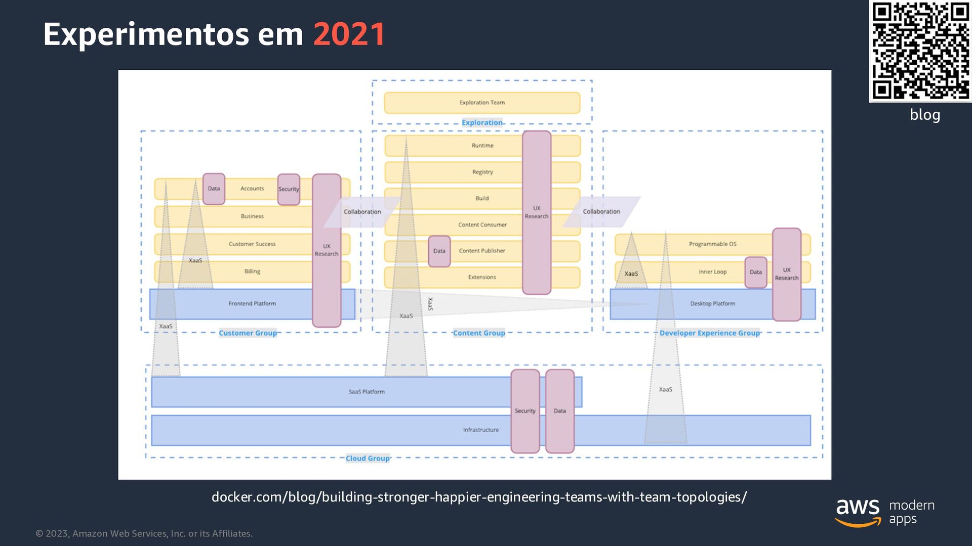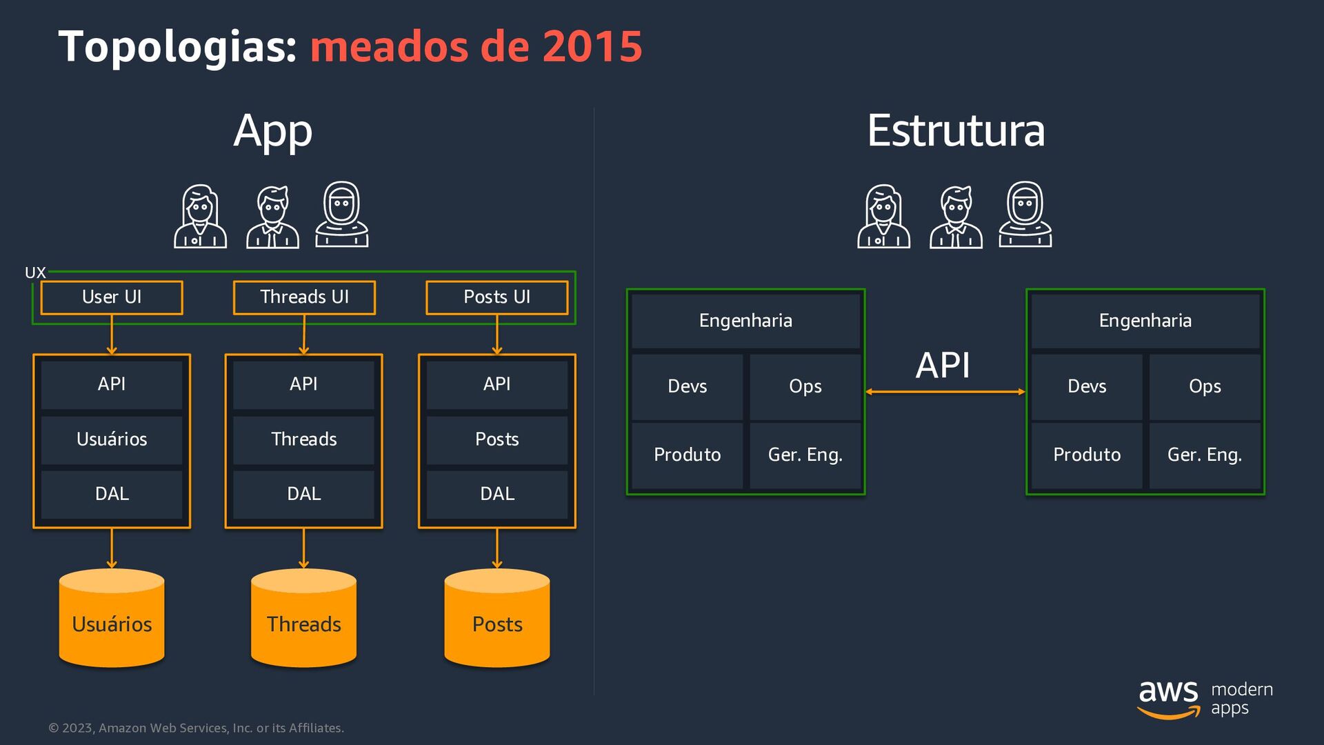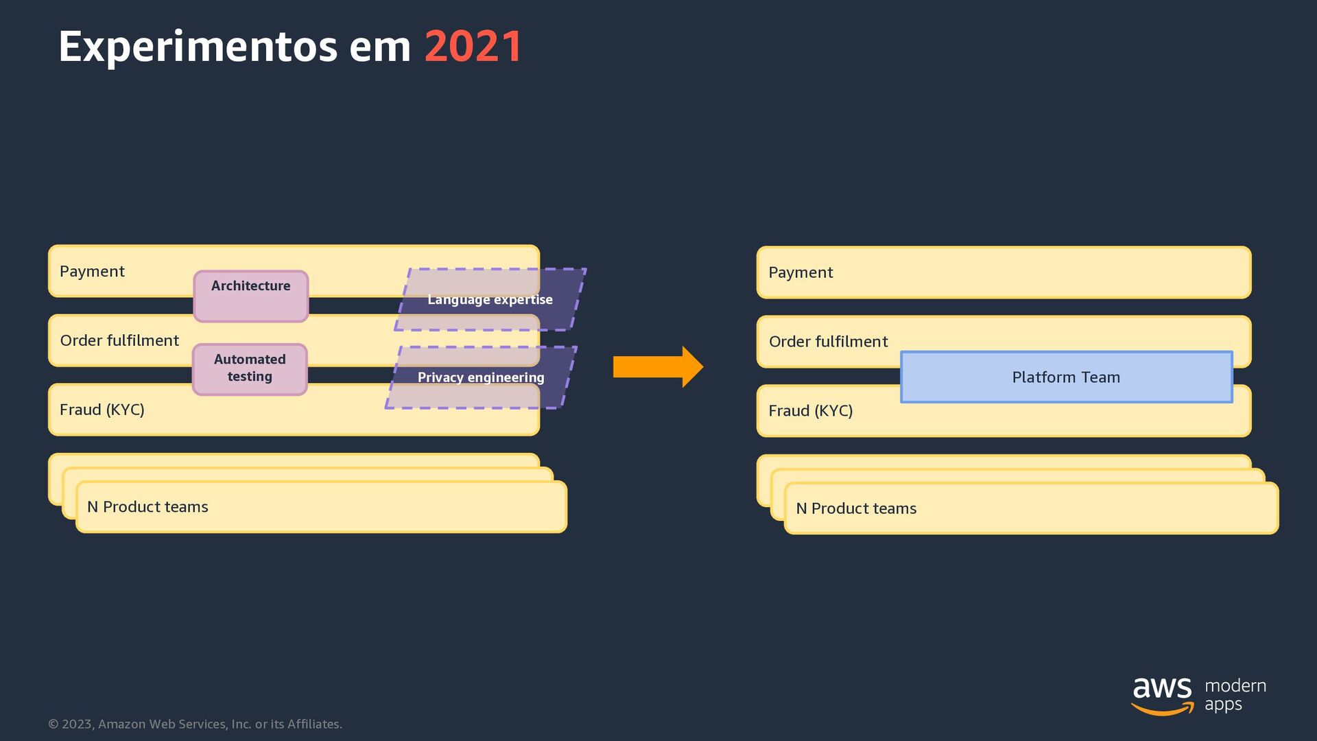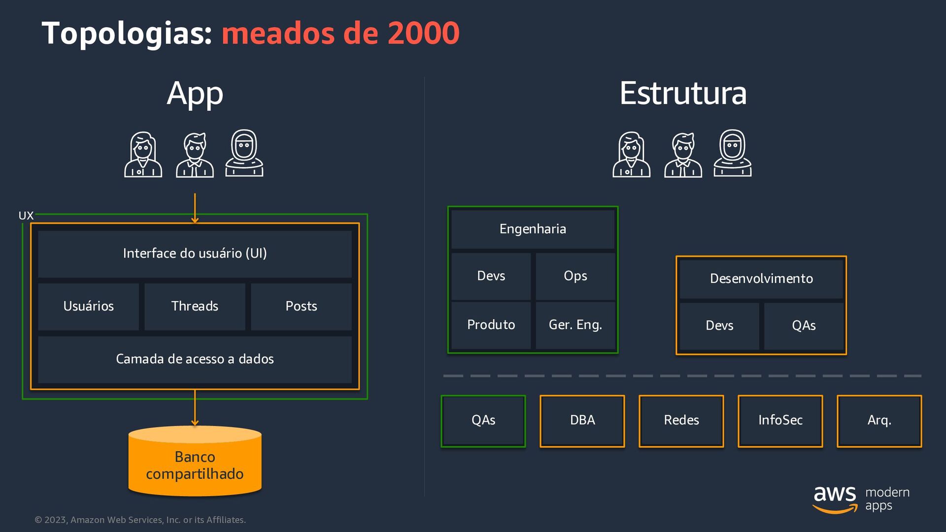 No final de 2016, à medida que mais organizações adotaram microsserviços, o processo de tomada de decisão se tornou mais descentralizado e, à medida que cresceram, as empresas aprenderam a se concentrar mais na construção da comunidade, no suporte e no fornecimento de orientação para evitar a repetição de erros do passado. Desde 2020 vemos o crescimento de Serverless e times divididos por área, o que nos leva a uma nova era de equipes cada vez menores, mas mais especializadas e adaptáveis às mudanças nos negócios.