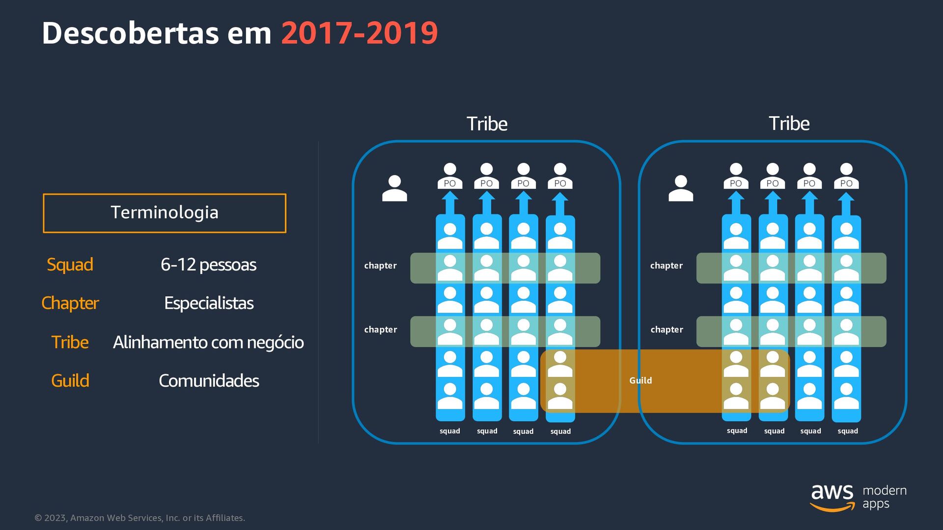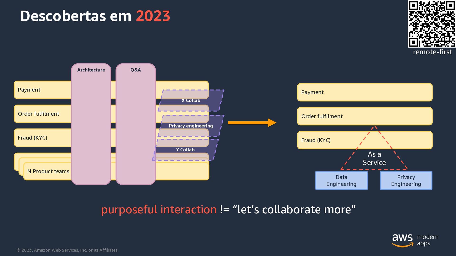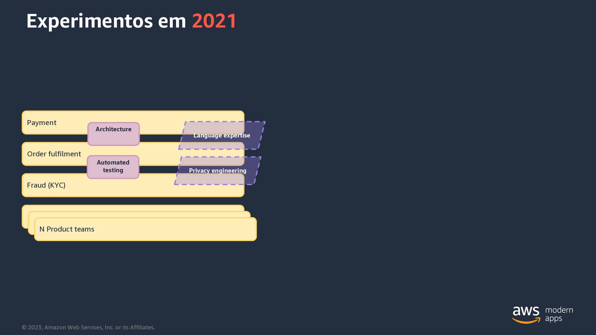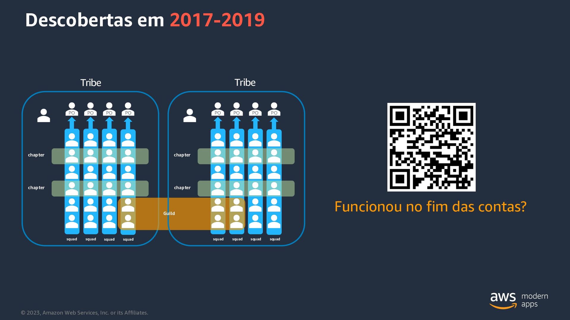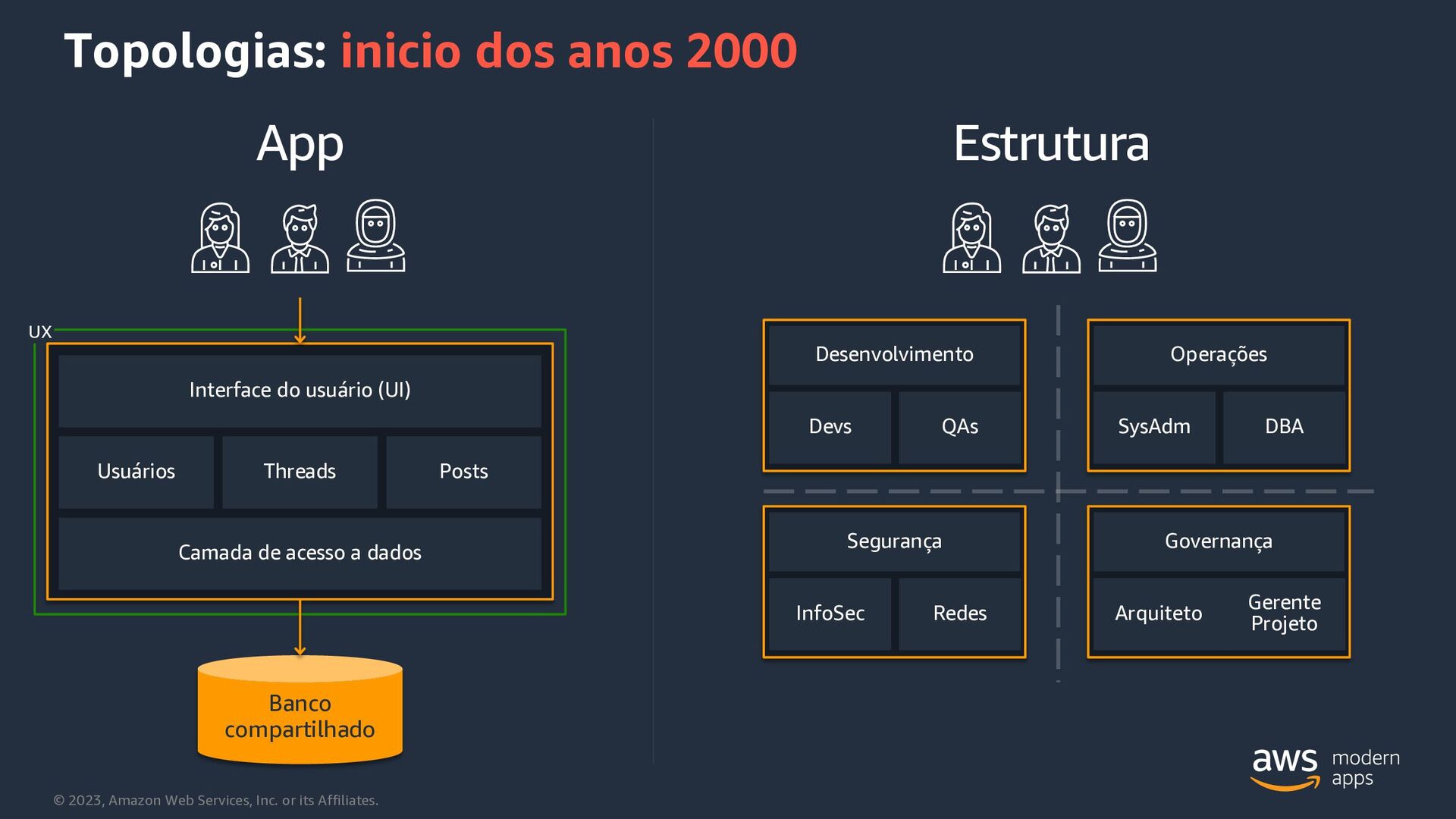 No final de 2016, à medida que mais organizações adotaram microsserviços, o processo de tomada de decisão se tornou mais descentralizado e, à medida que cresceram, as empresas aprenderam a se concentrar mais na construção da comunidade, no suporte e no fornecimento de orientação para evitar a repetição de erros do passado. Desde 2020 vemos o crescimento de Serverless e times divididos por área, o que nos leva a uma nova era de equipes cada vez menores, mas mais especializadas e adaptáveis às mudanças nos negócios.