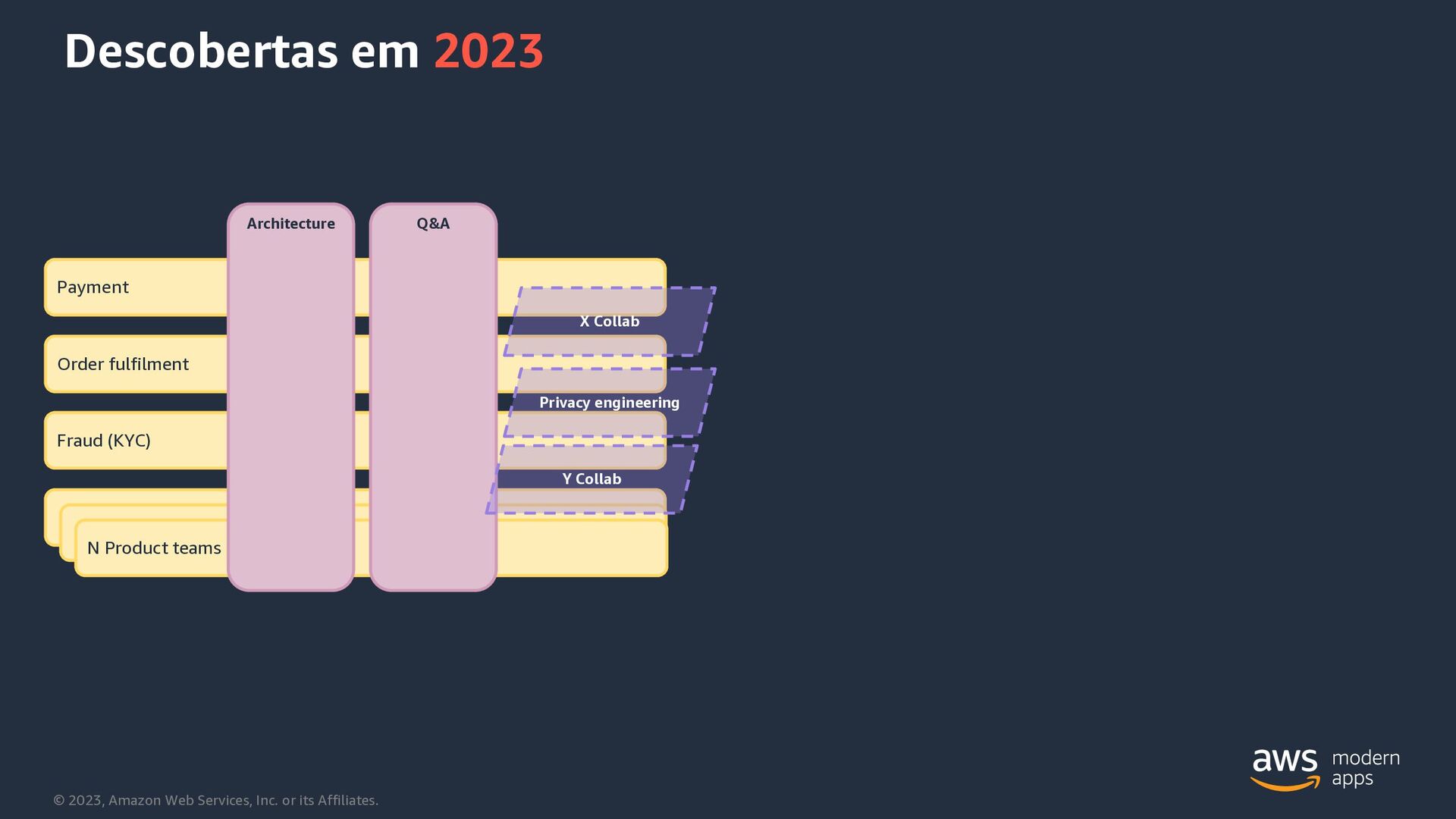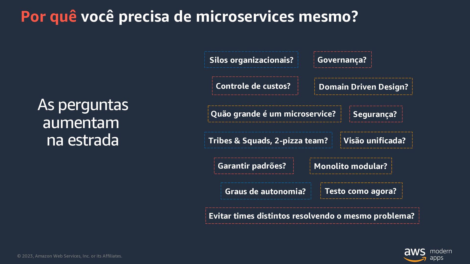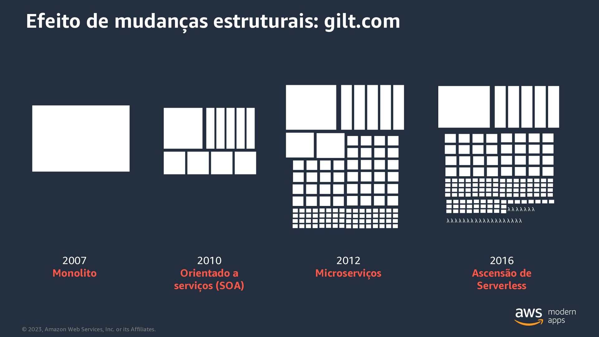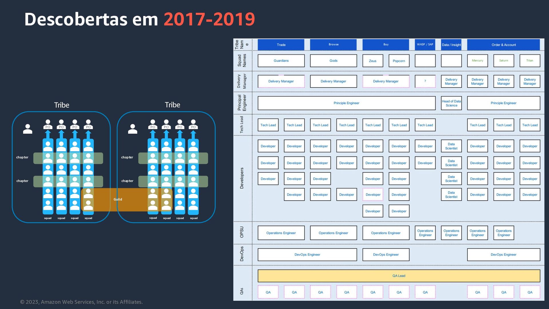 No final de 2016, à medida que mais organizações adotaram microsserviços, o processo de tomada de decisão se tornou mais descentralizado e, à medida que cresceram, as empresas aprenderam a se concentrar mais na construção da comunidade, no suporte e no fornecimento de orientação para evitar a repetição de erros do passado. Desde 2020 vemos o crescimento de Serverless e times divididos por área, o que nos leva a uma nova era de equipes cada vez menores, mas mais especializadas e adaptáveis às mudanças nos negócios.