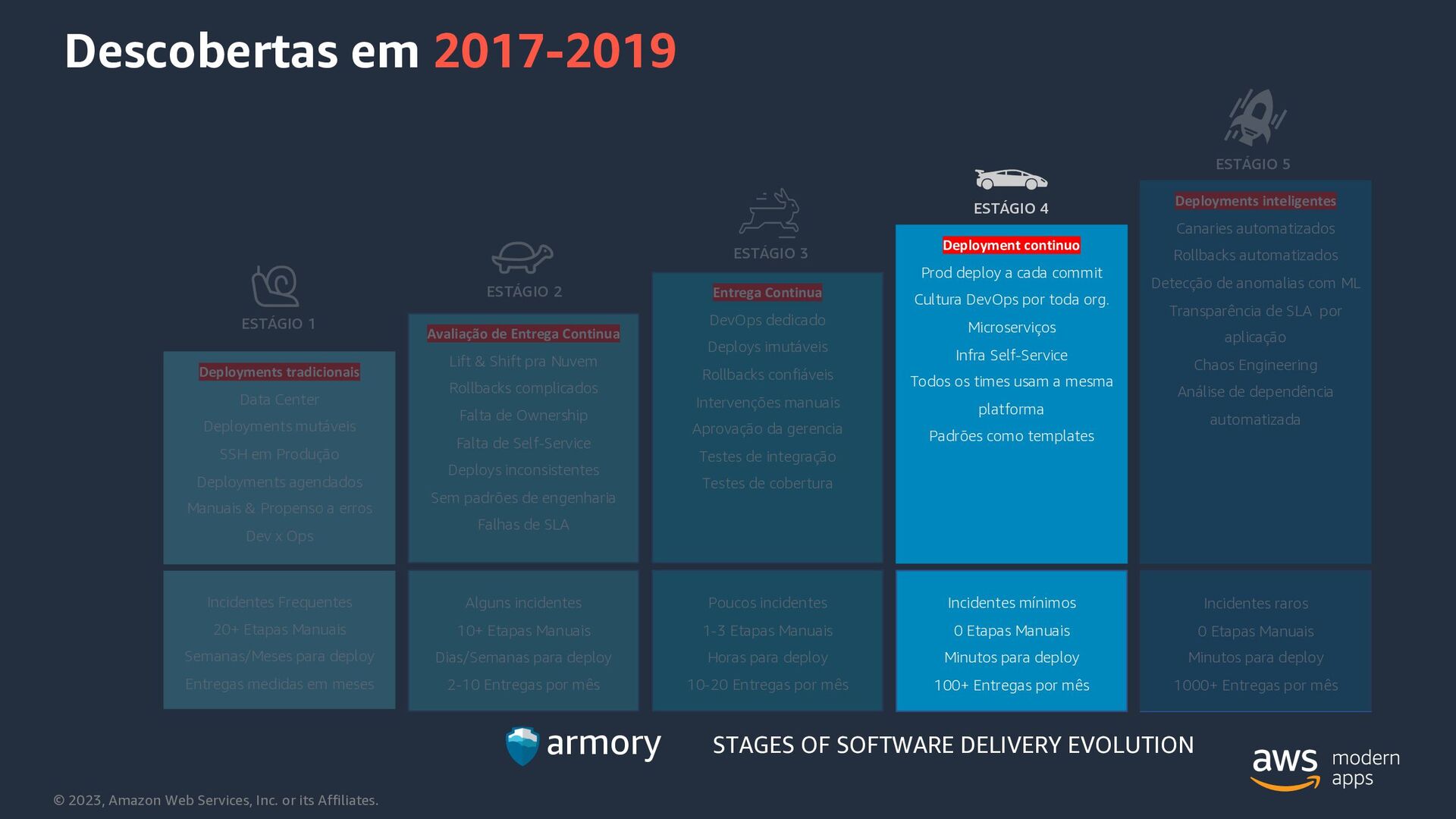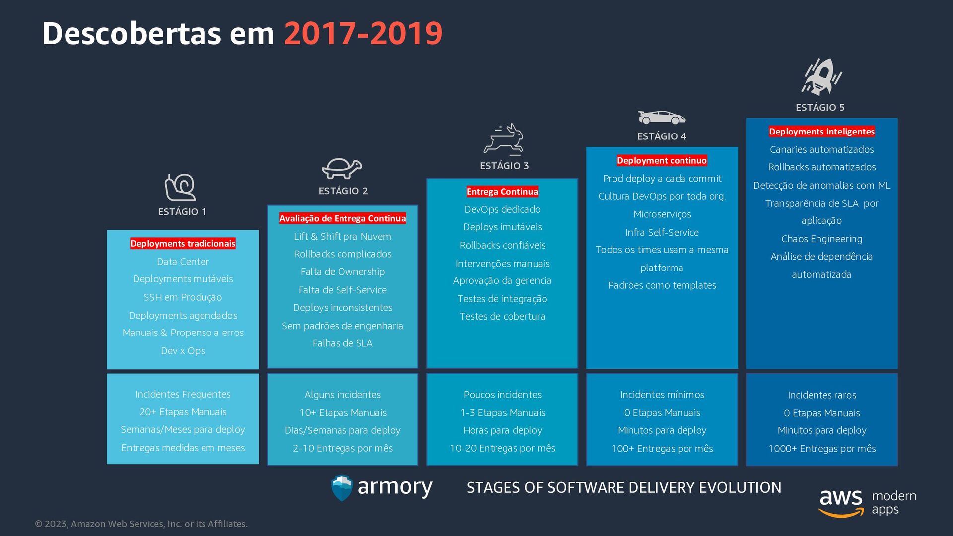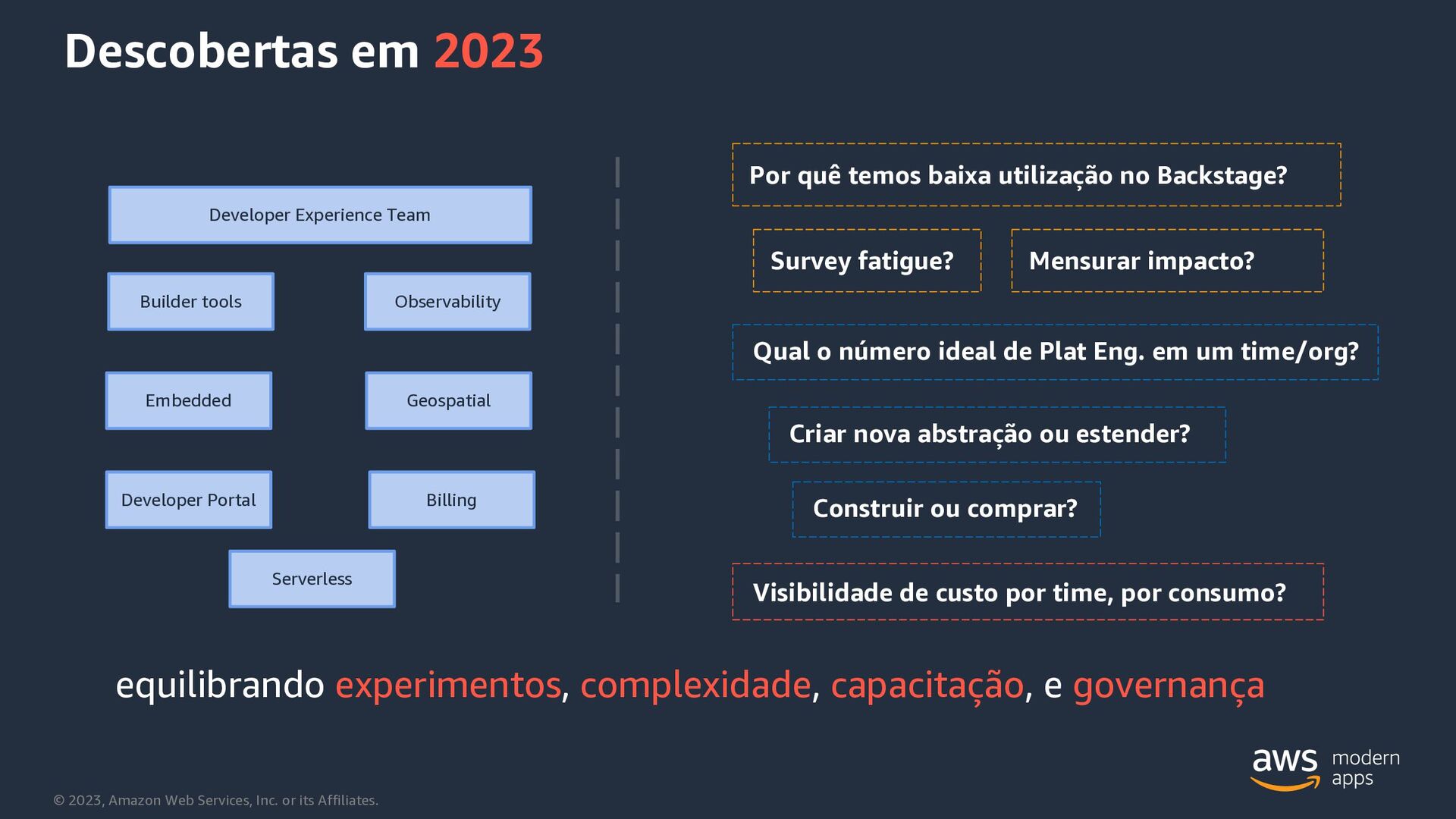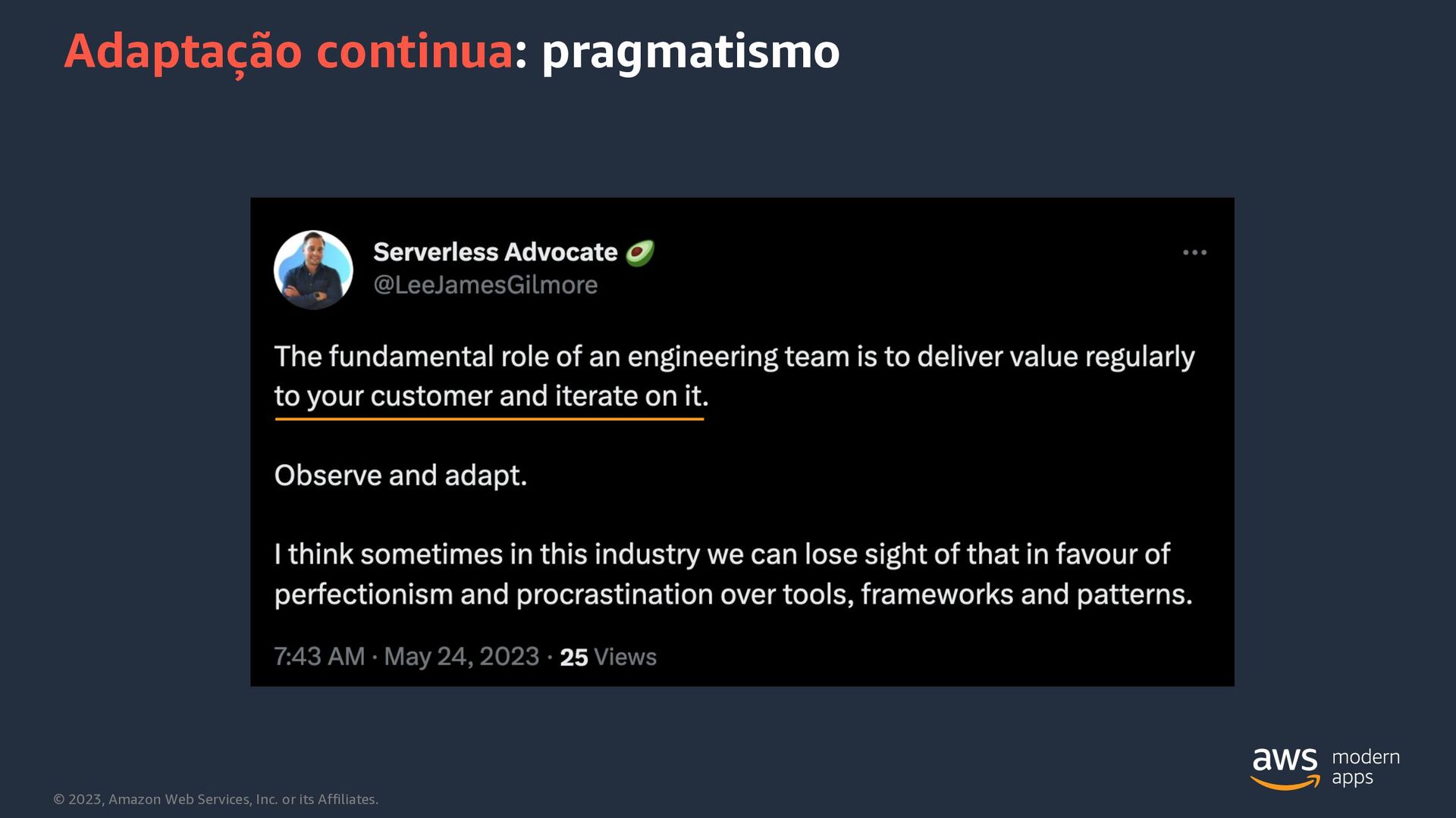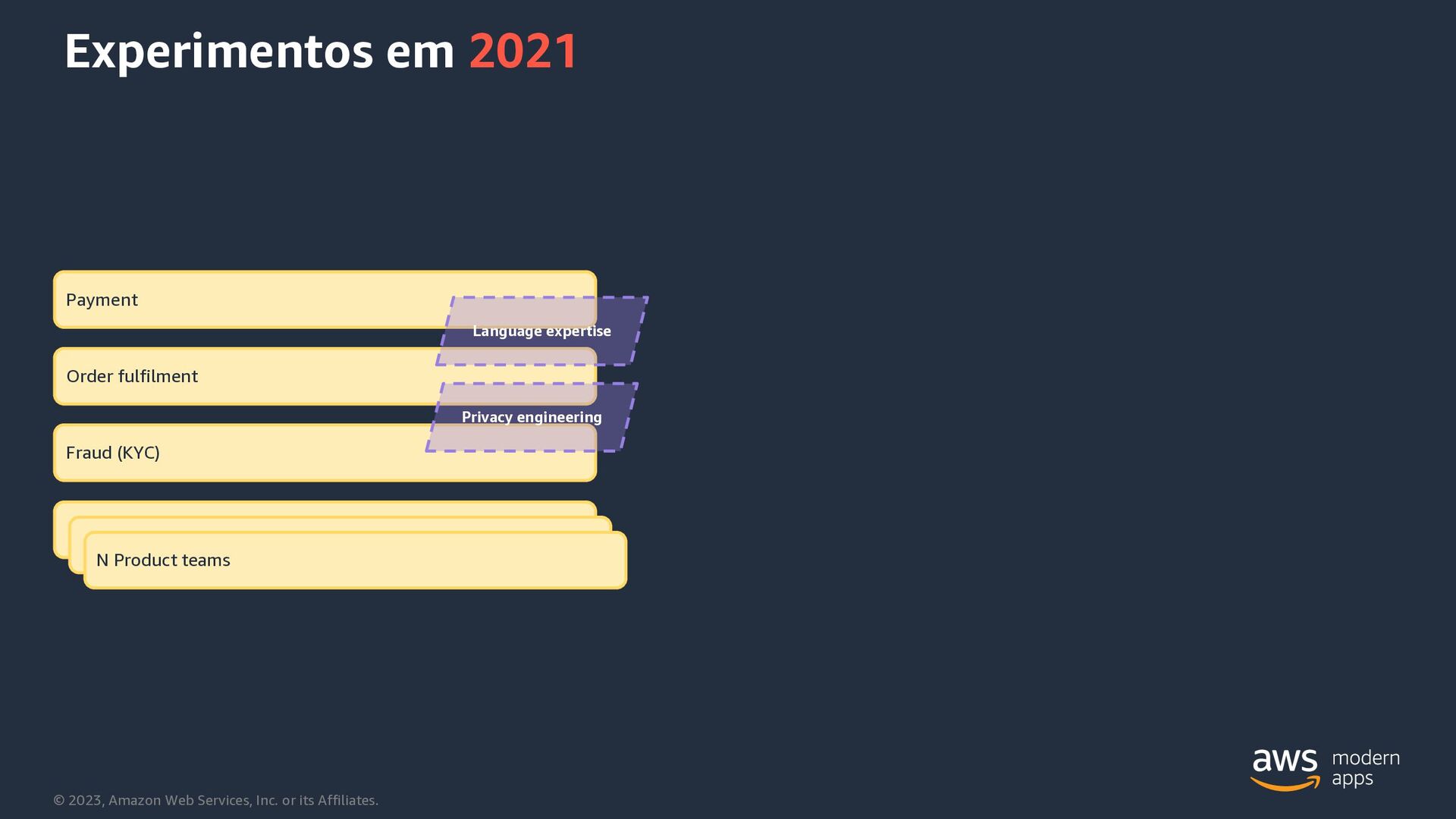 No final de 2016, à medida que mais organizações adotaram microsserviços, o processo de tomada de decisão se tornou mais descentralizado e, à medida que cresceram, as empresas aprenderam a se concentrar mais na construção da comunidade, no suporte e no fornecimento de orientação para evitar a repetição de erros do passado. Desde 2020 vemos o crescimento de Serverless e times divididos por área, o que nos leva a uma nova era de equipes cada vez menores, mas mais especializadas e adaptáveis às mudanças nos negócios.