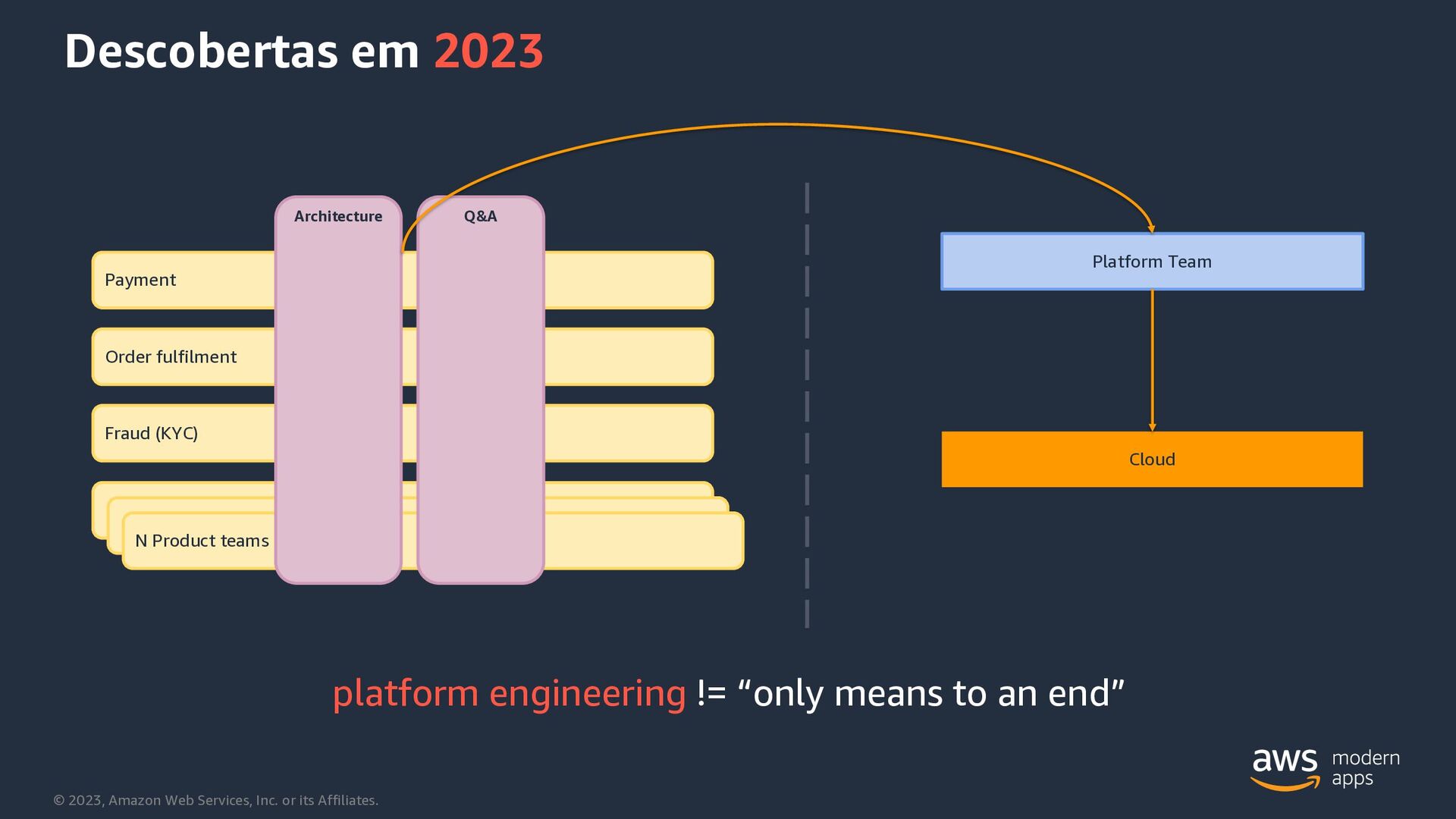 As escolhas de arquitetura e a Cloud influenciaram profundamente como as equipes e os processos aceleraram o tempo de lançamento de um determinado produto ou serviço. Na última década, muitas organizações passaram do formato de silos entre equipes de engenharia e operacionais para equipes semiautônomas. Em 2015 vimos o surgimento do engenheiro de automação, uma posição que veio para ajudar as organizações a fazer uso mais eficiente da nuvem e que agora cresce cada vez mais sob o termo de Platform Engineering.