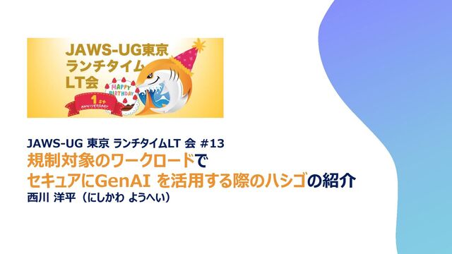 JAWS-UG 東京 ランチタイムLT 会 #13 規制対象のワークロードで セキュアにGenAI を活用する際のハシゴの紹介 西川 洋平(にしかわ