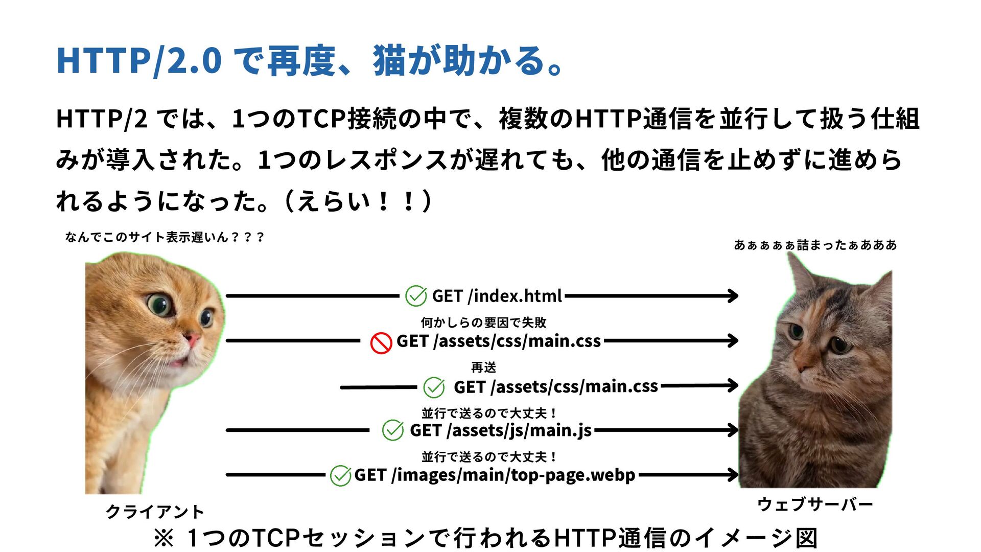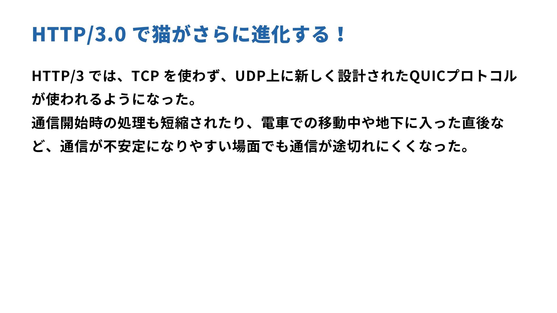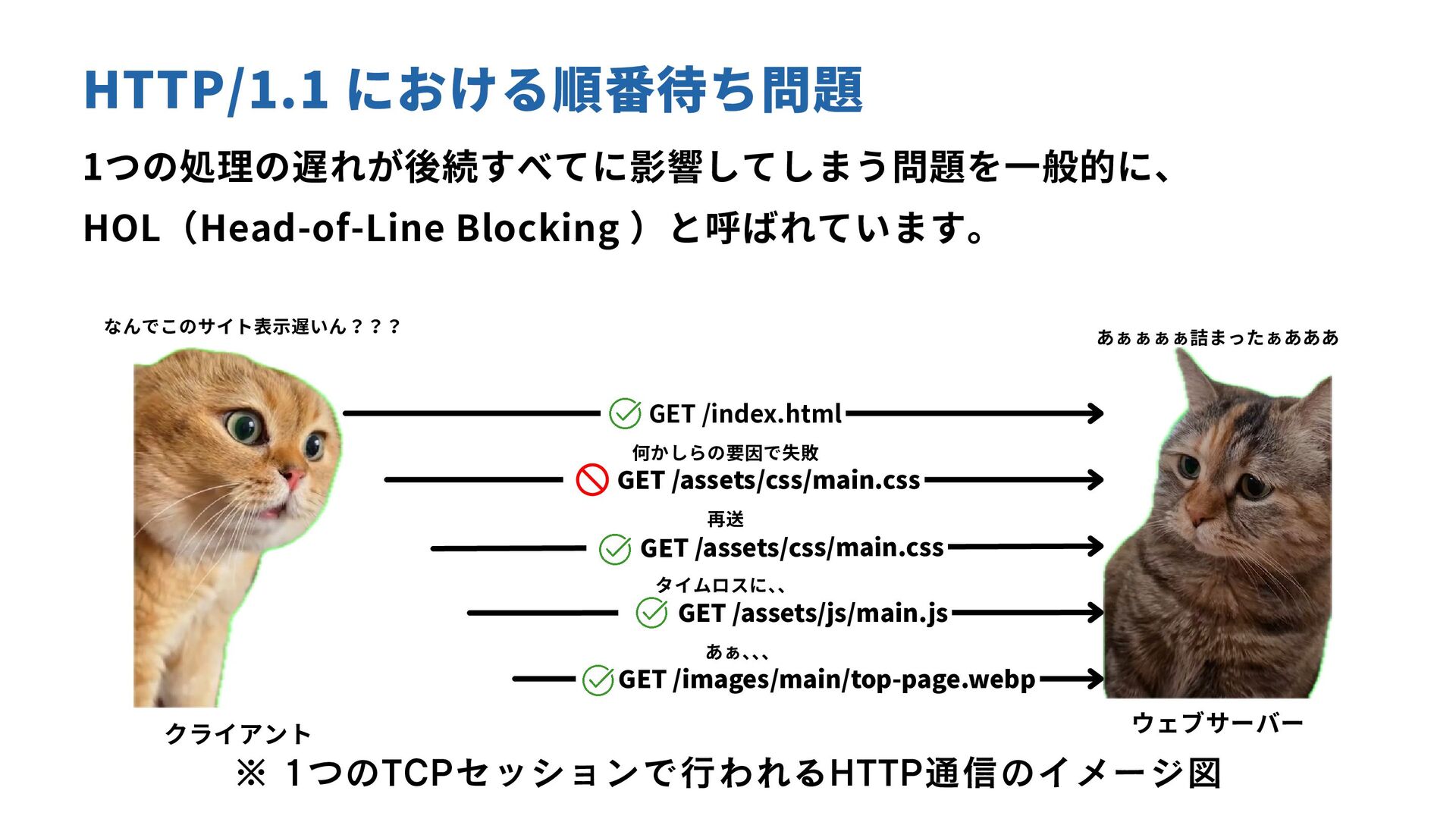HTTP/1.1 の改善点と限界、HTTP/2 による多重化、不安定なネットワーク環境に強い HTTP/3(QUIC)までを図と猫を使って簡単に説明しています。