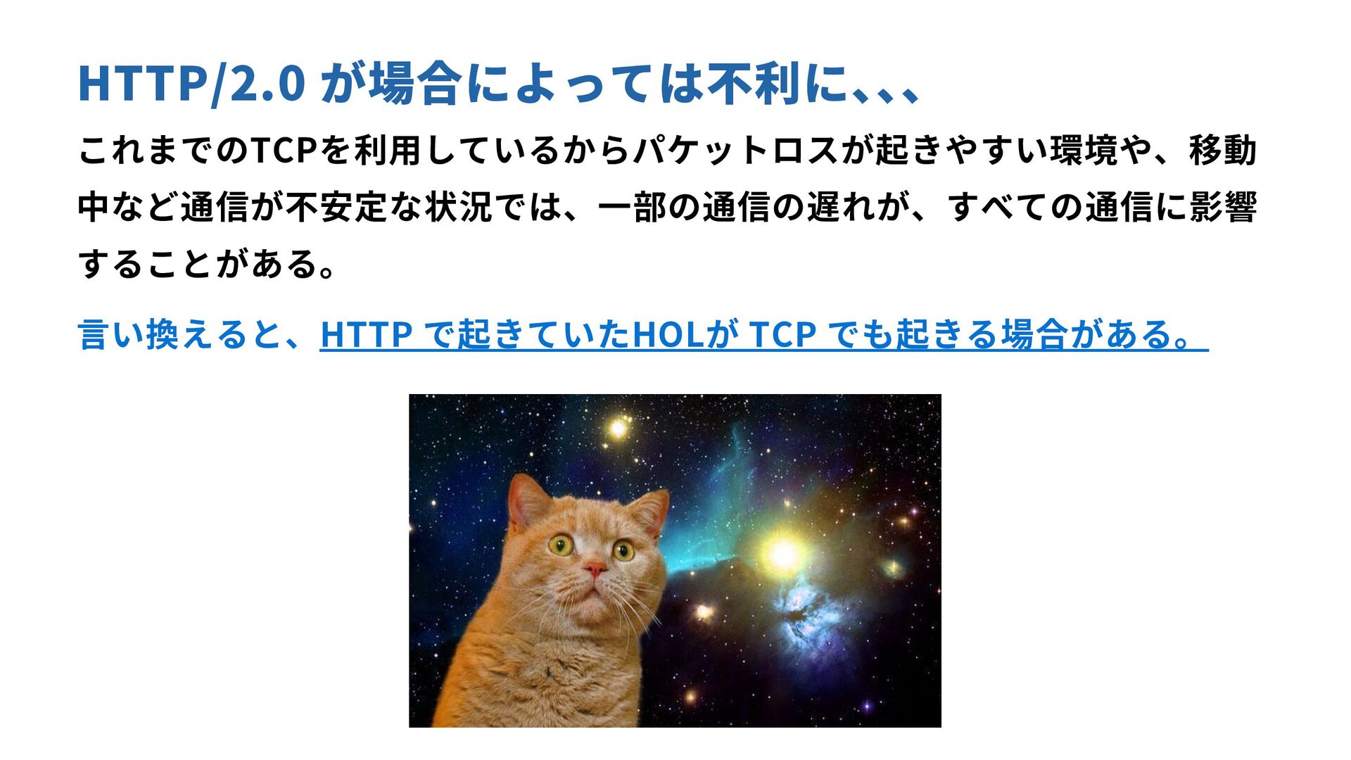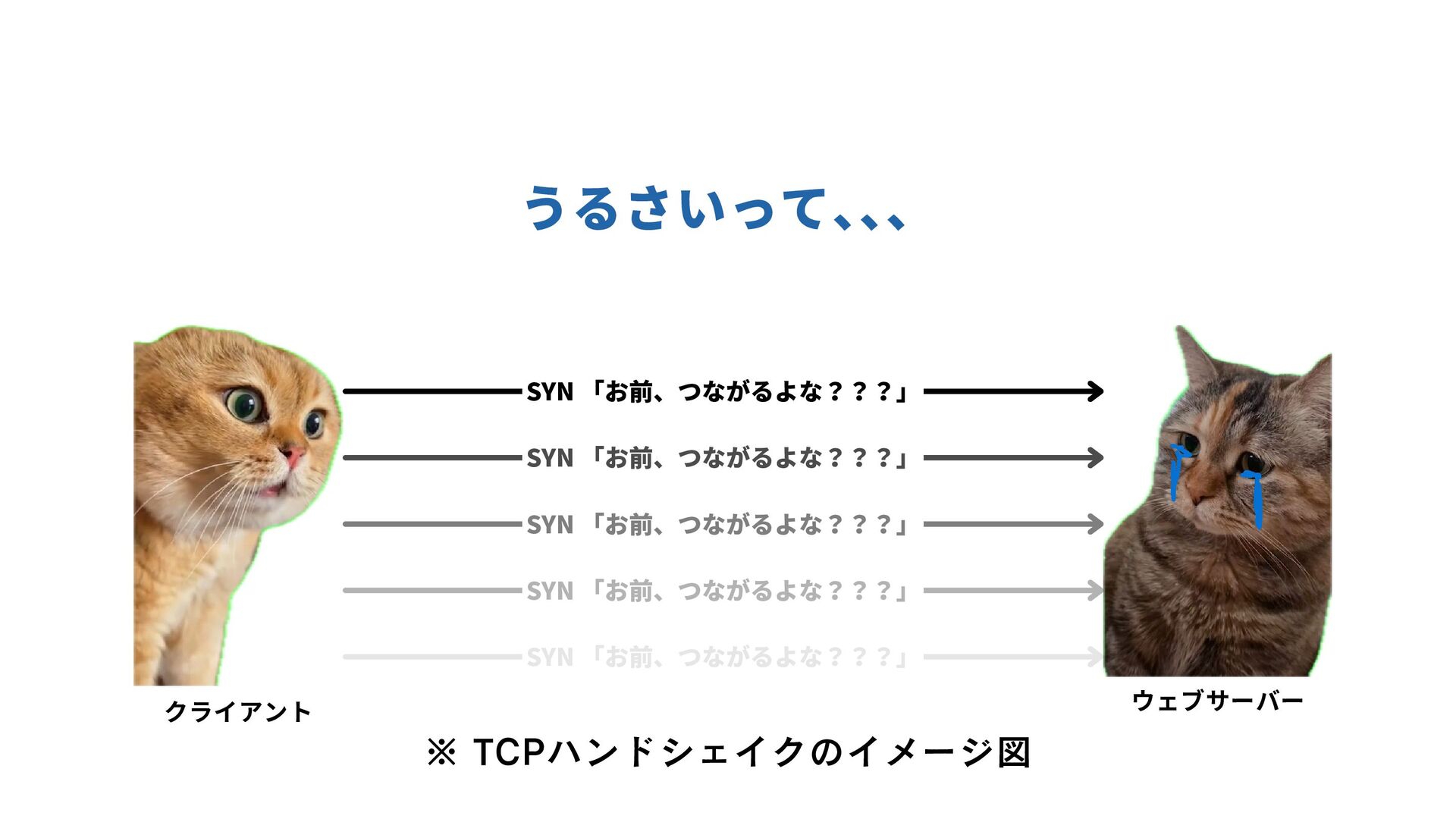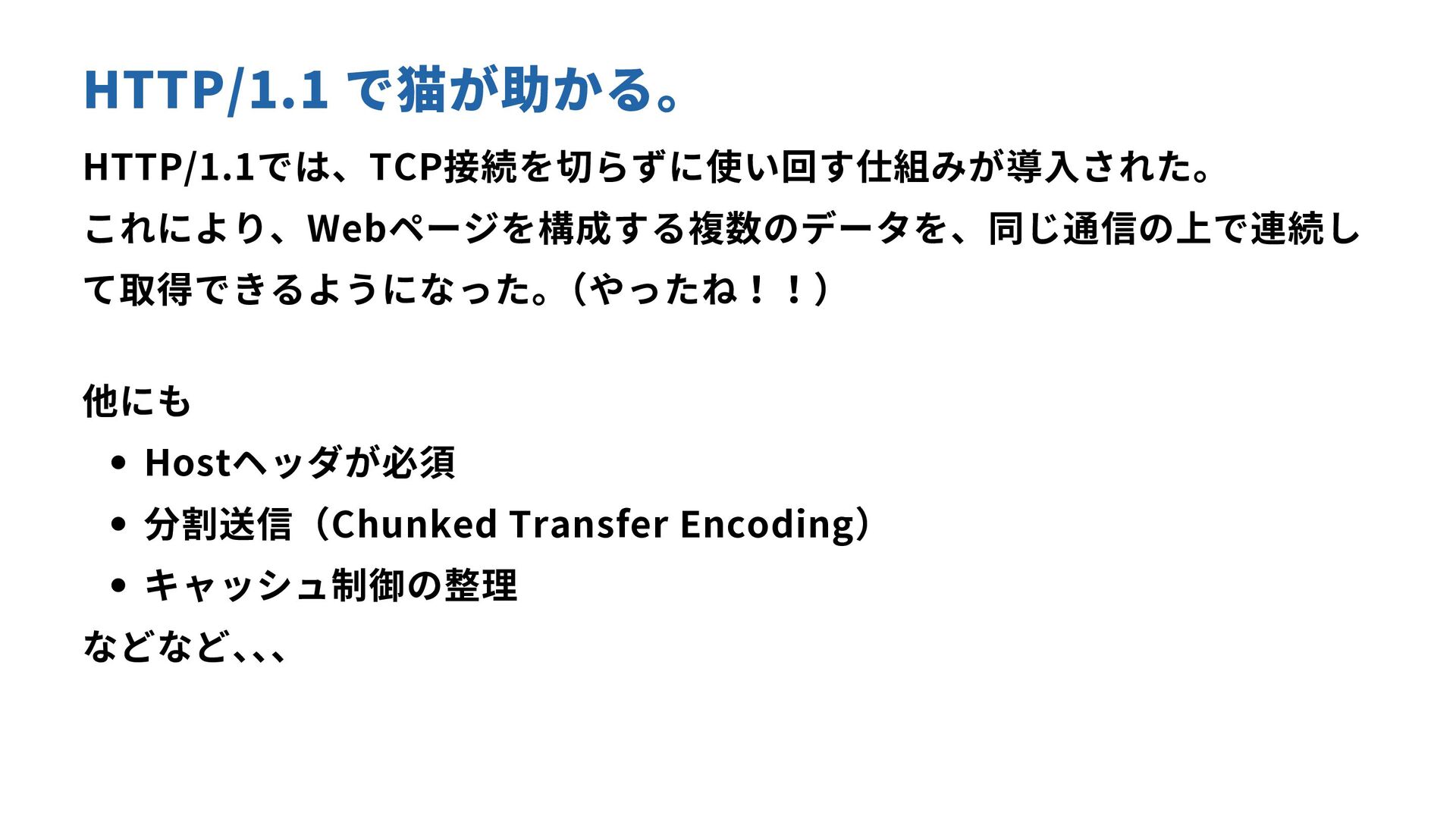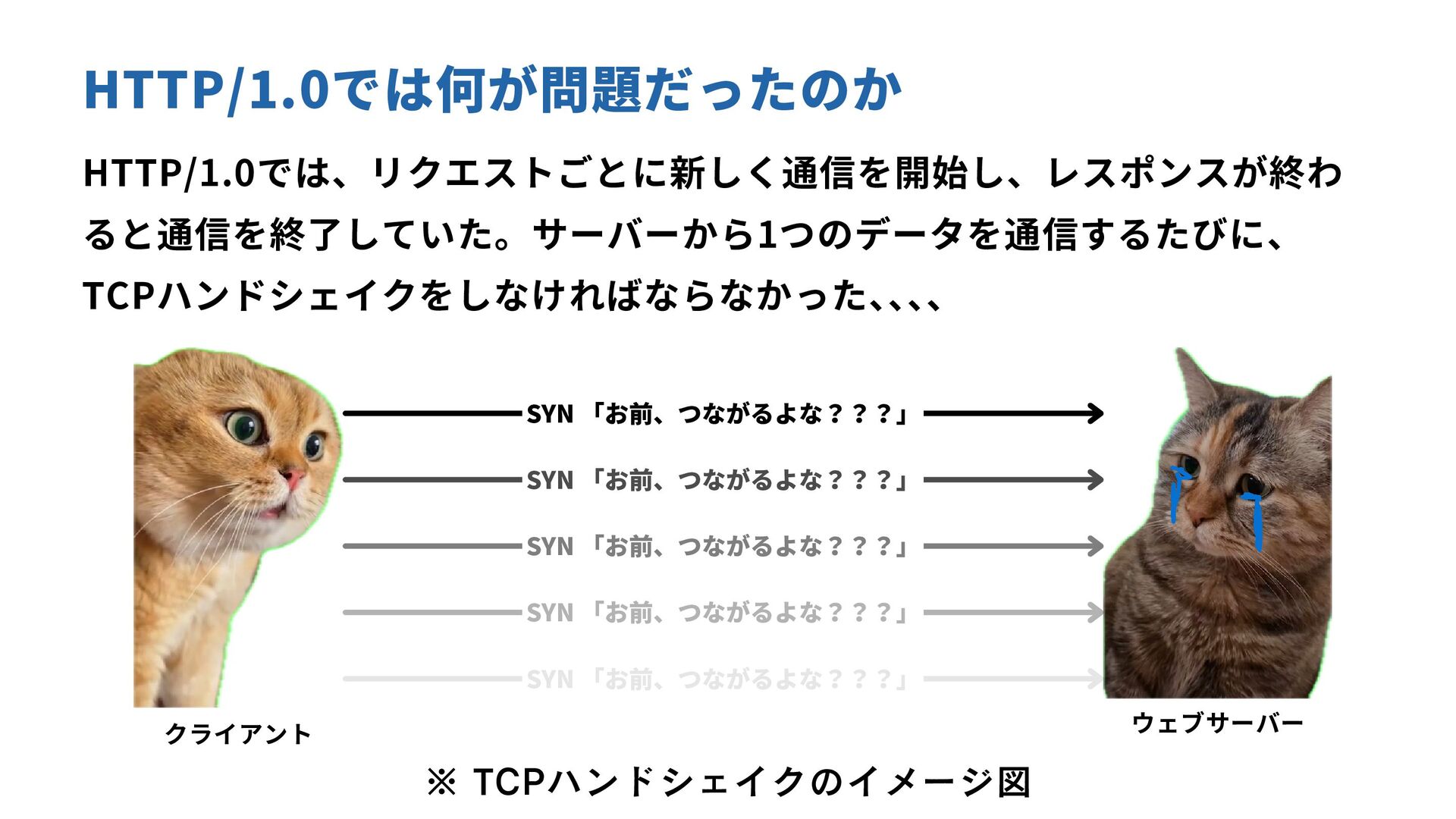 HTTP/1.1 の改善点と限界、HTTP/2 による多重化、不安定なネットワーク環境に強い HTTP/3(QUIC)までを図と猫を使って簡単に説明しています。