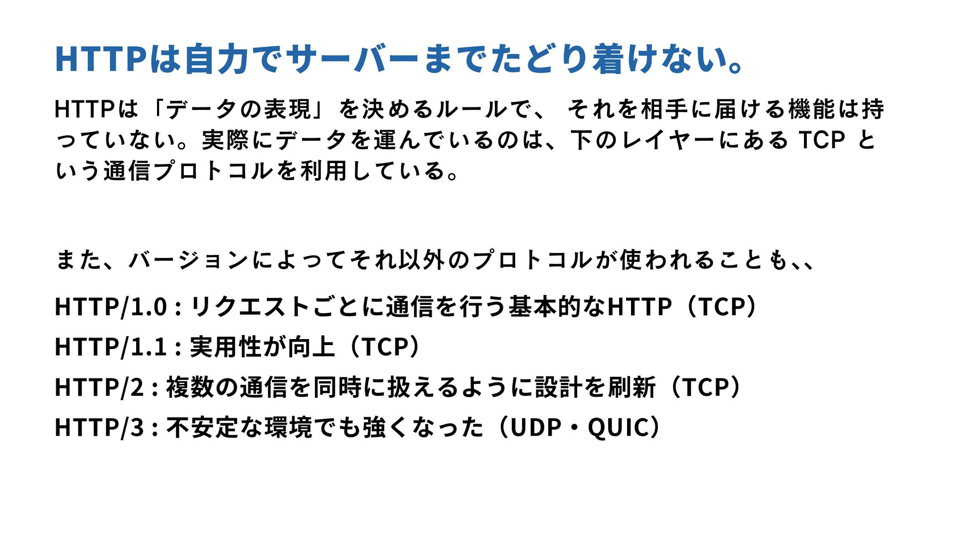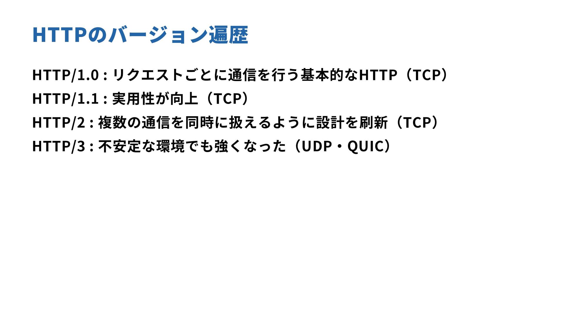 HTTP/1.0 から HTTP/3 までの進化を「なぜそう変わってきたのか」という視点で解説するスライドです。
