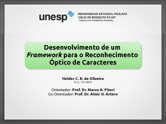recognition. [S.l.]: Wiley, 1999. (Wiley series in microwave and optical engineering). [2] JAIN, L.; LAZZERINI, B. Knowledge-based intelligent techniques in character recognition. [S.l.]: CRC Press, 1999. (The CRC Press international series on computational intelligence). [3] PARKER, J. R. Algorithms for image processing and computer vision. [S.l.]: Wiley Computing, 2010. 504 p. [4] CHERIET, M.; KHARMA, N.; LIU, C. Character recognition systems: a guide for students and practitioners. [S.l.]: Wiley-Interscience, 2007. [5] BUNKE, H.; WANG, P. Handbook of character recognition and document image analysis. [S.l.]: World Scientific, 1997. [6] DAVIES, E. Computer and Machine Vision: Theory, algorithms, practicalities. [S.l.]: Elsevier Science, 2012. [7] TRIER Øivind D.; JAIN, A. K.; TAXT, T. Feature extraction methods for character recognition - a survey. Pattern Recognition, v. 29, n. 4, p. 641 – 662, 1996. ISSN 0031-3203. [8] BIGUN, J. Vision with direction: a systematic introduction to image processing and computer vision. [S.l.]: Springer, 2006.
