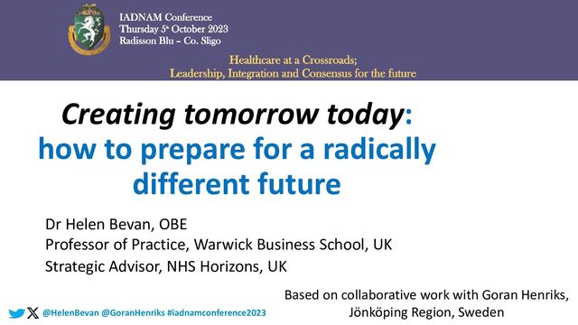 future Dr Helen Bevan, OBE Professor of Practice, Warwick Business School, UK Strategic Advisor, NHS Horizons, UK Based on collaborative work with Goran Henriks, Jönköping Region, Sweden @HelenBevan @GoranHenriks #iadnamconference2023
