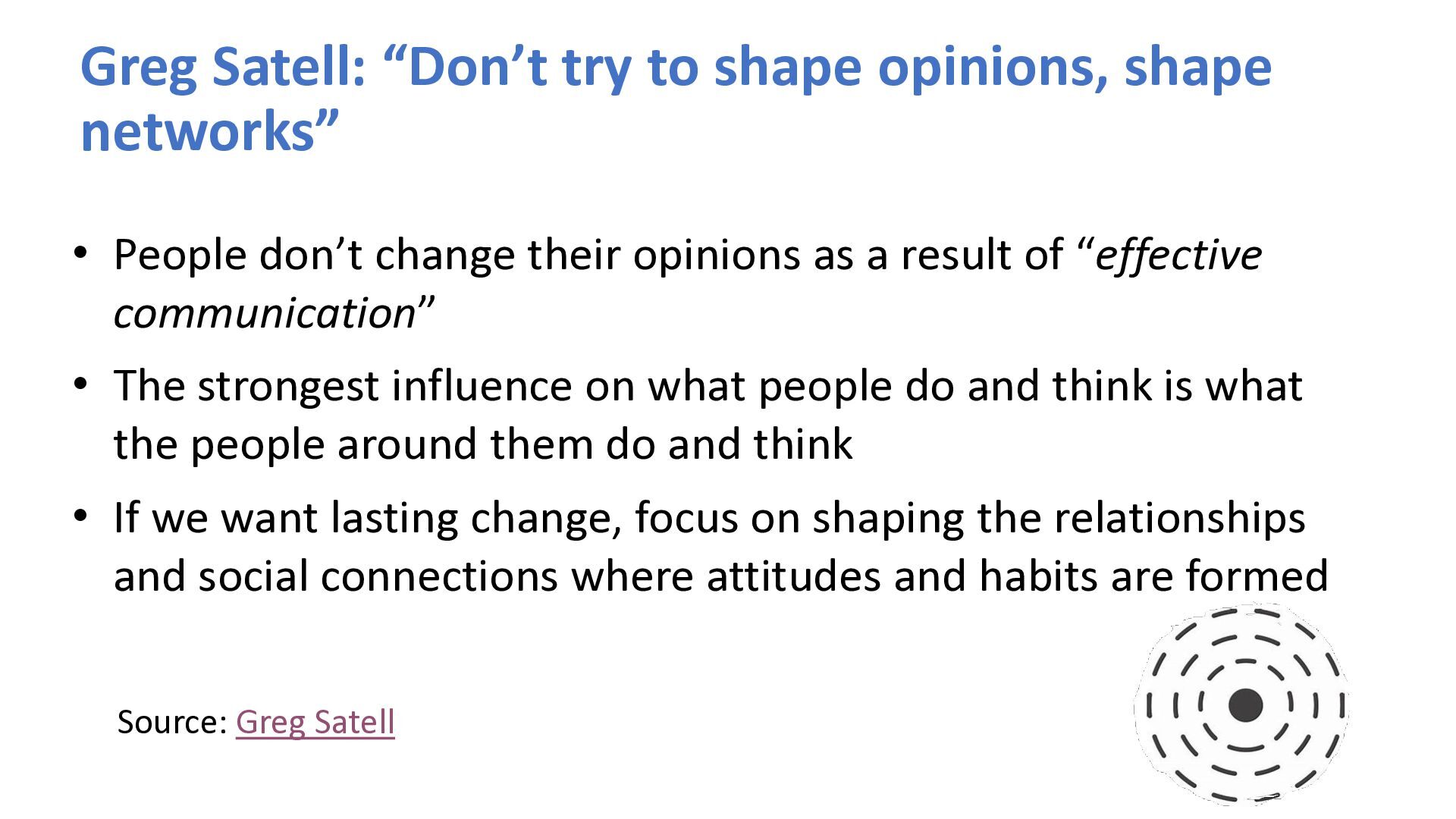 People don’t change their opinions as a result of “effective communication” • The strongest influence on what people do and think is what the people around them do and think • If we want lasting change, focus on shaping the relationships and social connections where attitudes and habits are formed Source: Greg Satell