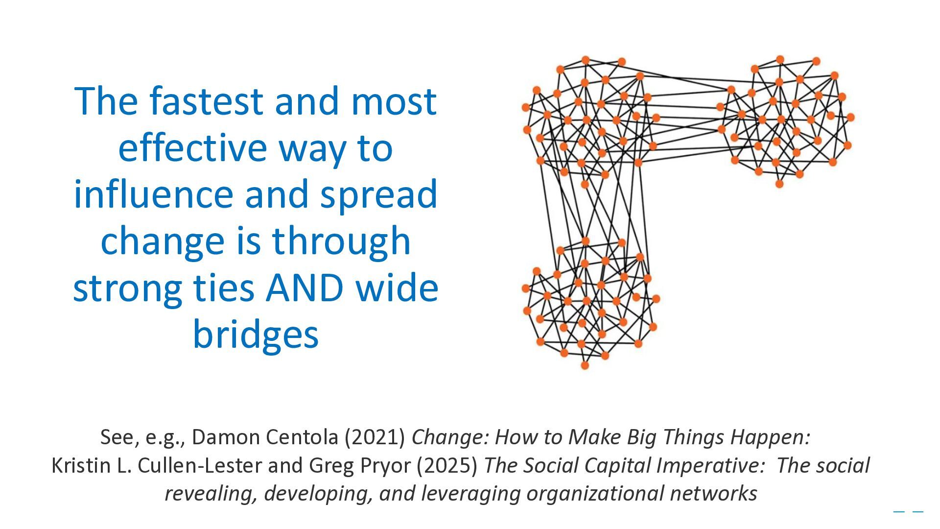 Things Happen: Kristin L. Cullen-Lester and Greg Pryor (2025) The Social Capital Imperative: The social revealing, developing, and leveraging organizational networks The fastest and most effective way to influence and spread change is through strong ties AND wide bridges