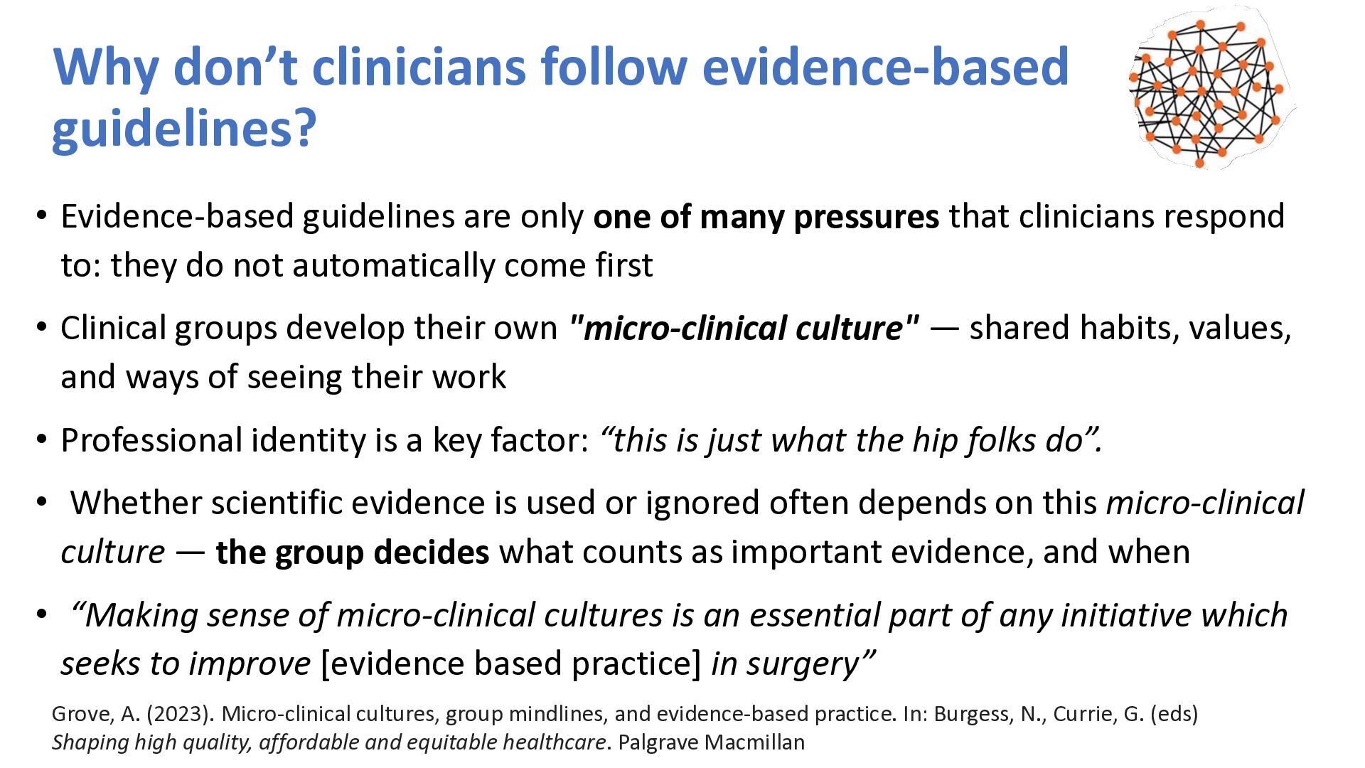 only one of many pressures that clinicians respond to: they do not automatically come first • Clinical groups develop their own "micro-clinical culture" — shared habits, values, and ways of seeing their work • Professional identity is a key factor: “this is just what the hip folks do”. • Whether scientific evidence is used or ignored often depends on this micro-clinical culture — the group decides what counts as important evidence, and when • “Making sense of micro-clinical cultures is an essential part of any initiative which seeks to improve [evidence based practice] in surgery” Grove, A. (2023). Micro-clinical cultures, group mindlines, and evidence-based practice. In: Burgess, N., Currie, G. (eds) Shaping high quality, affordable and equitable healthcare. Palgrave Macmillan