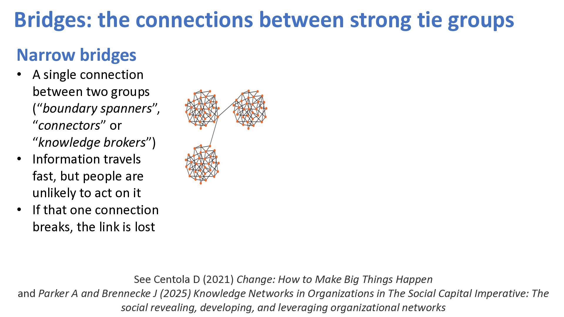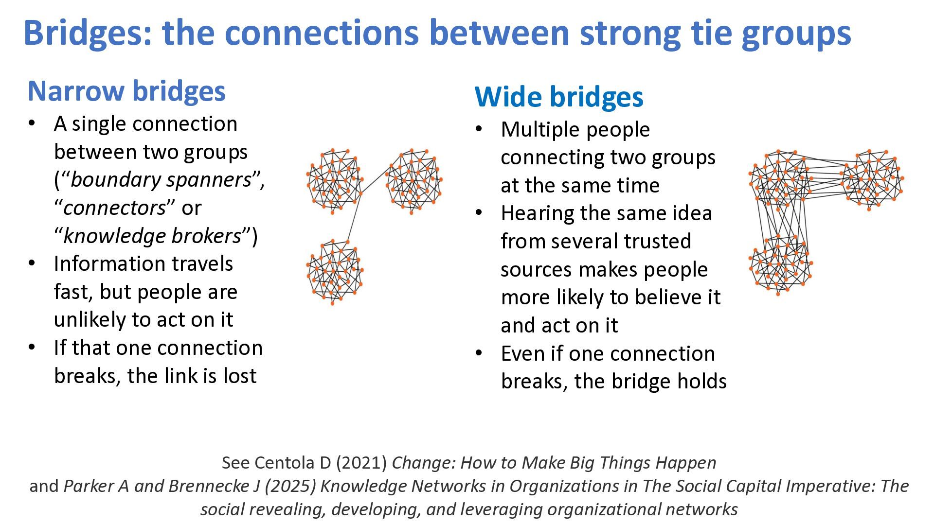 spanners”, “connectors” or “knowledge brokers”) • Information travels fast, but people are unlikely to act on it • If that one connection breaks, the link is lost Wide bridges • Multiple people connecting two groups at the same time • Hearing the same idea from several trusted sources makes people more likely to believe it and act on it • Even if one connection breaks, the bridge holds Bridges: the connections between strong tie groups See Centola D (2021) Change: How to Make Big Things Happen and Parker A and Brennecke J (2025) Knowledge Networks in Organizations in The Social Capital Imperative: The social revealing, developing, and leveraging organizational networks