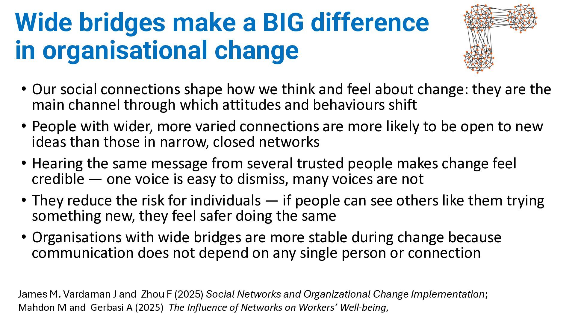 Our social connections shape how we think and feel about change: they are the main channel through which attitudes and behaviours shift • People with wider, more varied connections are more likely to be open to new ideas than those in narrow, closed networks • Hearing the same message from several trusted people makes change feel credible — one voice is easy to dismiss, many voices are not • They reduce the risk for individuals — if people can see others like them trying something new, they feel safer doing the same • Organisations with wide bridges are more stable during change because communication does not depend on any single person or connection James M. Vardaman J and Zhou F (2025) Social Networks and Organizational Change Implementation; Mahdon M and Gerbasi A (2025) The Influence of Networks on Workers’ Well-being,