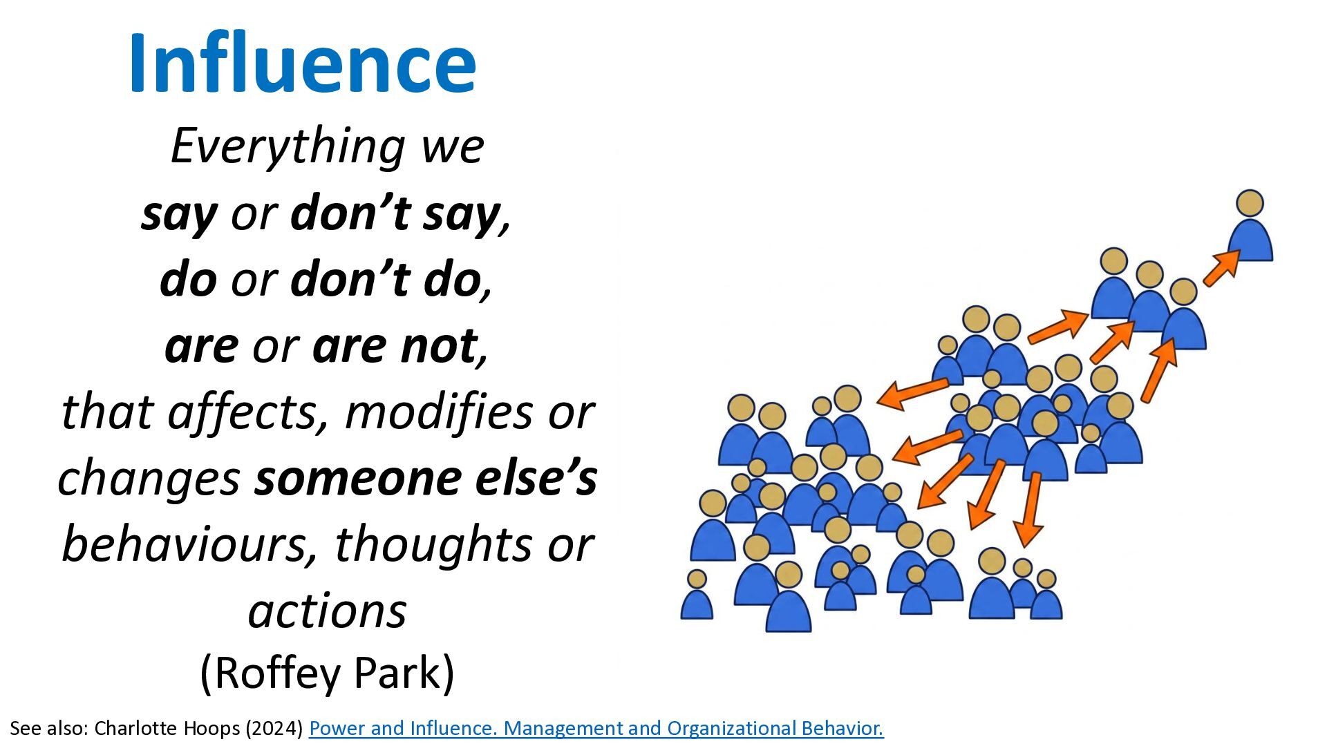 are or are not, that affects, modifies or changes someone else’s behaviours, thoughts or actions (Roffey Park) See also: Charlotte Hoops (2024) Power and Influence. Management and Organizational Behavior. Influence