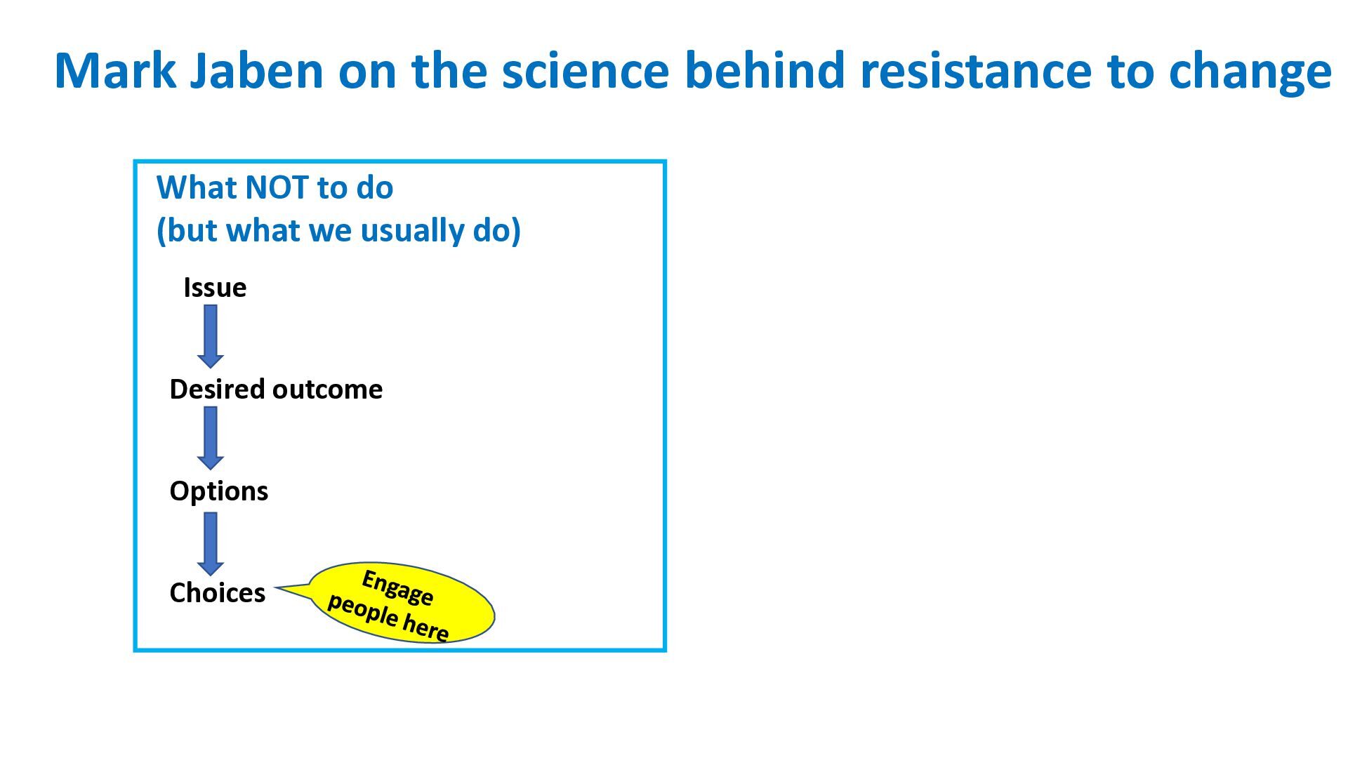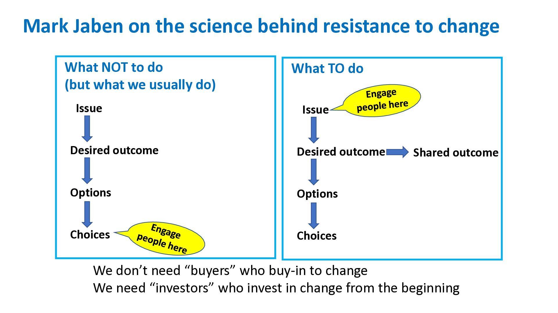 NOT to do (but what we usually do) Issue Desired outcome Options Choices What TO do Issue Desired outcome Options Choices Shared outcome We don’t need “buyers” who buy-in to change We need “investors” who invest in change from the beginning