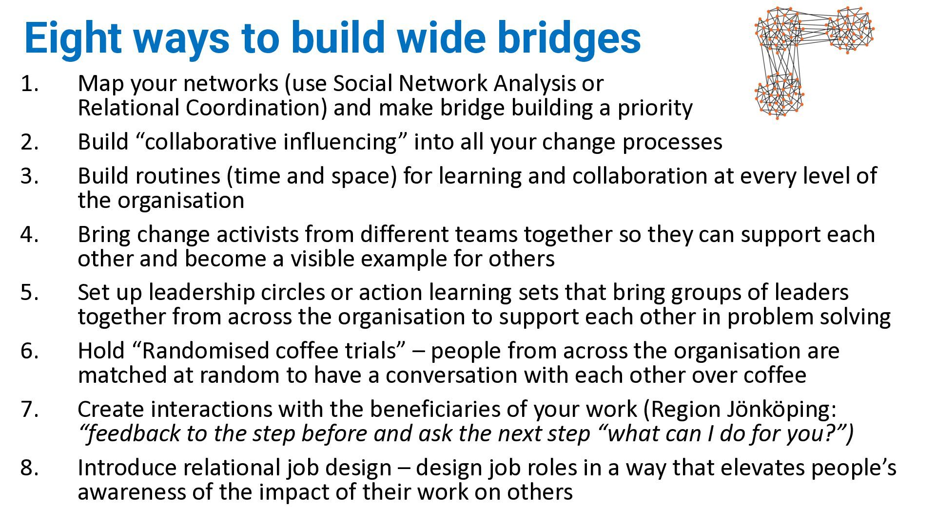 (use Social Network Analysis or Relational Coordination) and make bridge building a priority 2. Build “collaborative influencing” into all your change processes 3. Build routines (time and space) for learning and collaboration at every level of the organisation 4. Bring change activists from different teams together so they can support each other and become a visible example for others 5. Set up leadership circles or action learning sets that bring groups of leaders together from across the organisation to support each other in problem solving 6. Hold “Randomised coffee trials” – people from across the organisation are matched at random to have a conversation with each other over coffee 7. Create interactions with the beneficiaries of your work (Region Jönköping: “feedback to the step before and ask the next step “what can I do for you?”) 8. Introduce relational job design – design job roles in a way that elevates people’s awareness of the impact of their work on others