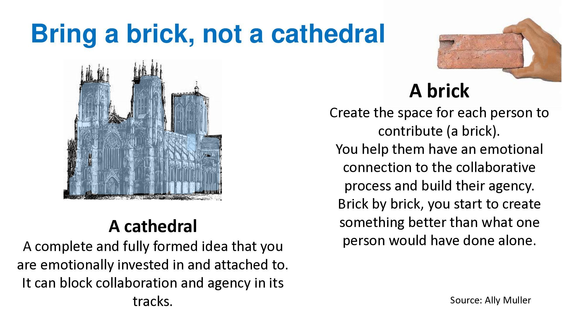 are emotionally invested in and attached to. It can block collaboration and agency in its tracks. A brick Create the space for each person to contribute (a brick). You help them have an emotional connection to the collaborative process and build their agency. Brick by brick, you start to create something better than what one person would have done alone. Source: Ally Muller Bring a brick, not a cathedral