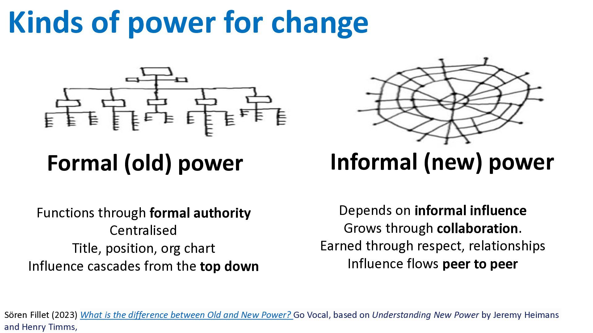 power Depends on informal influence Grows through collaboration. Earned through respect, relationships Influence flows peer to peer Functions through formal authority Centralised Title, position, org chart Influence cascades from the top down Sören Fillet (2023) What is the difference between Old and New Power? Go Vocal, based on Understanding New Power by Jeremy Heimans and Henry Timms,