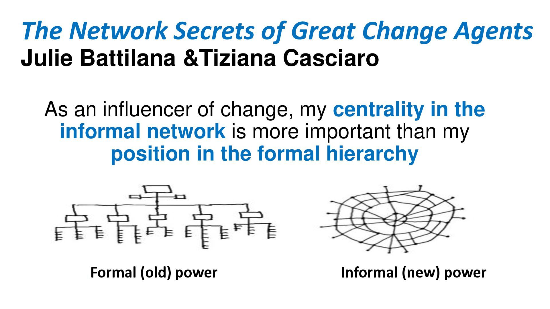 Casciaro As an influencer of change, my centrality in the informal network is more important than my position in the formal hierarchy Formal (old) power Informal (new) power